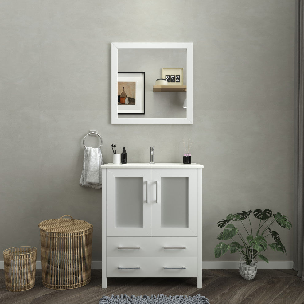 Let the clean-lined look of this vanity by Vanity Art guide your bathroom toward a cool, contemporary design. Single-sink vanity setIncludes mirror, countertop, sink basin, and cabinet hardwareDoes not include the faucetCeramic countertopSoft-closing hardware1-year parts warranty against manufacture defectsColor: Espresso, Gray, White, BlueMaterials: Solid + Manufactured Wood, MirrorMirror dimensions: 27.56" x 27.56"Vanity dimensions: W 29.9" x D 18.1" x H 35.8"