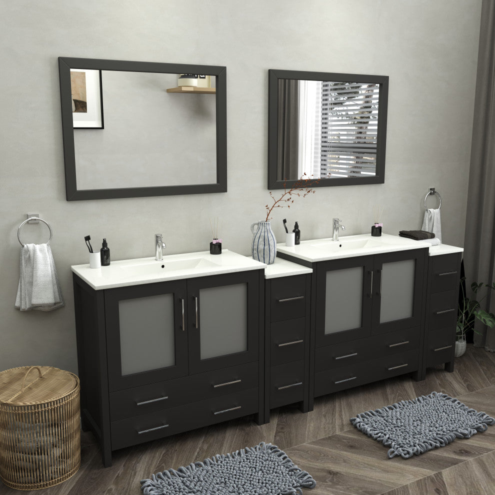Update your bathroom with this ceramic vanity set. white ceramic top contrasts with the cabinet''s color. freshen up your bathroom with this storage vanity sink. Vanity art 96-inch double sink bathroom vanity set offers an eye-catching focal point to your bathroom ensemble while increasing storage space. boasting a solid neutral finish features ten drawers and four cabinets for keeping crisp towels, cleaning supplies, and other bathroom essentials. The matching framed mirror is also included.Features:Moisture-proof and Eco-friendlyEasy InstallationSoft-closing door prevents slammingEasy to CleanDove-tailed drawersBrushed gold and brushed nickel handles/hardwareDuble-sink vanity set witH 35.8" vanity and two 12" cabinetsEnough Storage for all kinds of bathroom useFaucet & Drain Sold Separately.Specifications:Style: Modern & ContemporaryIncludes: Mirror, countertop, sink basin, and cabinet hardwareType: FreestandingFully Assembly: YesBase Material: Oak WoodColor: Espresso, Gray, White, BlueNumber of Cabinets: 4Number of Drawers: 10Number of Mirrors: 2Number of Sinks: 2Sink Shape: RectangleSink Type: Under-mountTop Material: CeramicMirror dimensions: W 35" x H 27.5"Cabinet dimensions: W 12" x D 18" x H 31"Vanity dimensions: W 36" x D 18" x H 35.8"Total dimensions: W 96" x D 18" x H 35.8"
