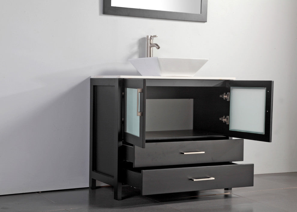 Let the clean-lined look of this vanity by Vanity Art guide your bathroom toward a cool, contemporary design. Single-sink vanity set witH 35.8" vanity and 12" cabinetIncludes standard mirror, countertop, sink basin and cabinet hardwareDoes not include faucetCeramic countertopSoft-closing hardware1-year parts warranty against manufacture defectsColor: EspressoMaterials: Solid + Manufactured Wood, MirrorMirror dimensions: W 35" x H 27.5"Cabinet dimensions: W 12" x D 18.5" x H 27"Vanity dimensions: W 36" x D 18.5" x H 35.8"Sink Dimensions: 16.1" W x 16.1" D x 4.7" HTotal dimensions: W 48" x D 18.5" x H 35.8"