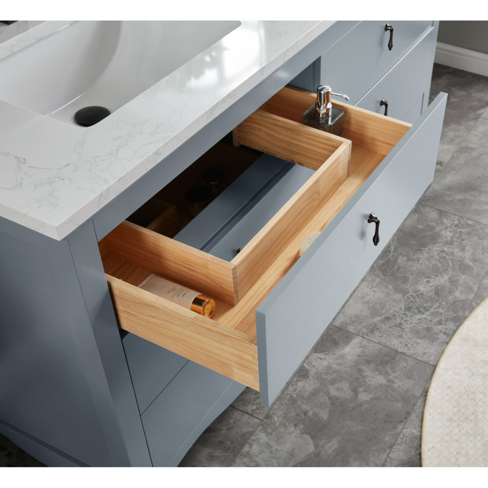 Dimensions: L:60 x W:22 x H:34.75Finish: Cadet1" artificial stone top, Ceramic sinkIncluded Faucet, Mirror and Wall LightingFaucet hole : 1Pre-drilled holeWood Material: Solid WoodHardware: Black1-year parts-only warranty on manufacturer defects