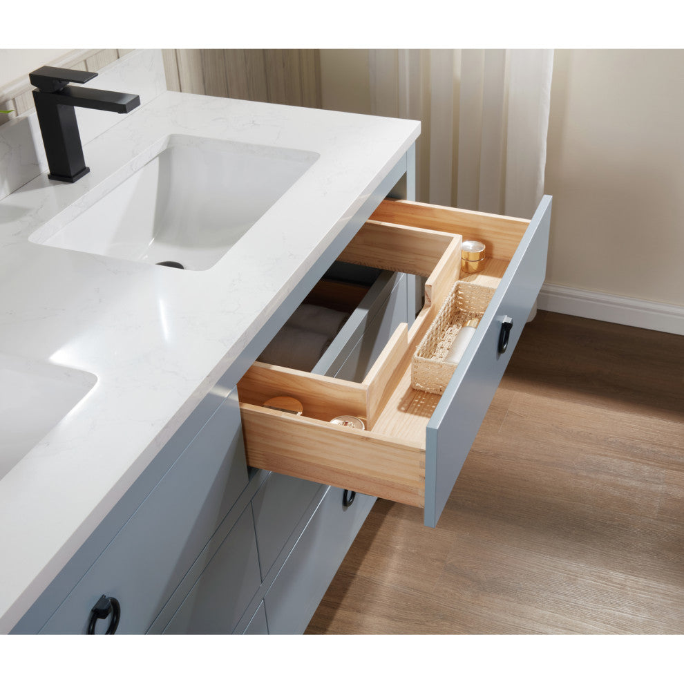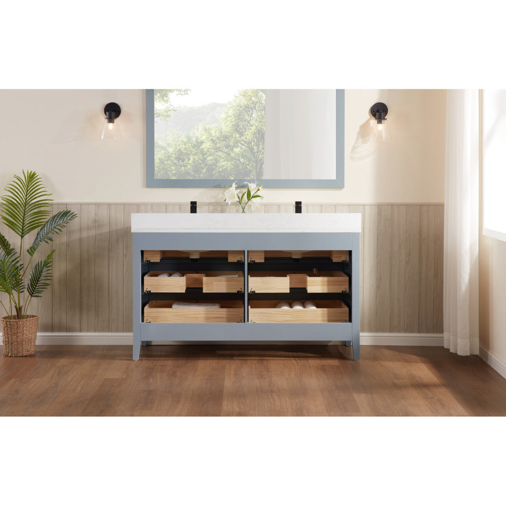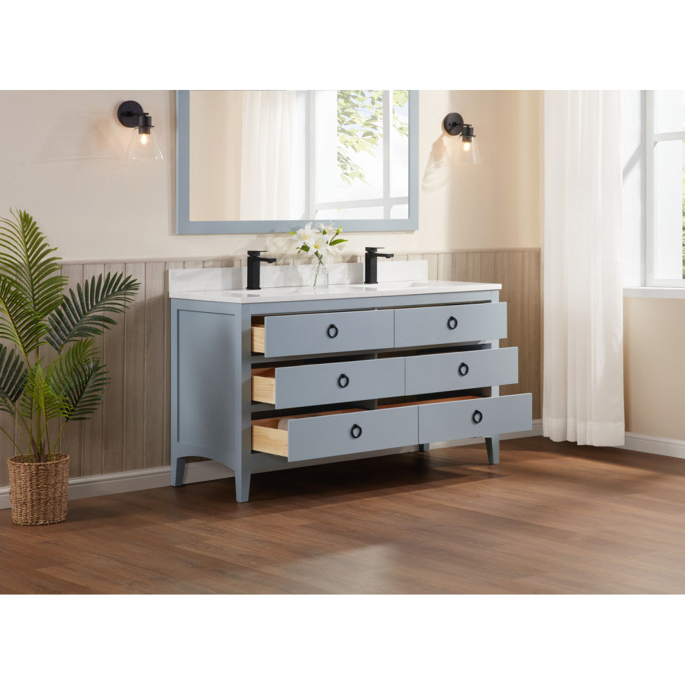 Dimensions: L:60 x W:22 x H:34.75Finish: Cadet1" artificial stone top, Ceramic sinkIncluded Faucet, Mirror and Wall LightingFaucet hole : 1Pre-drilled holeWood Material: Solid WoodHardware: Black1-year parts-only warranty on manufacturer defects