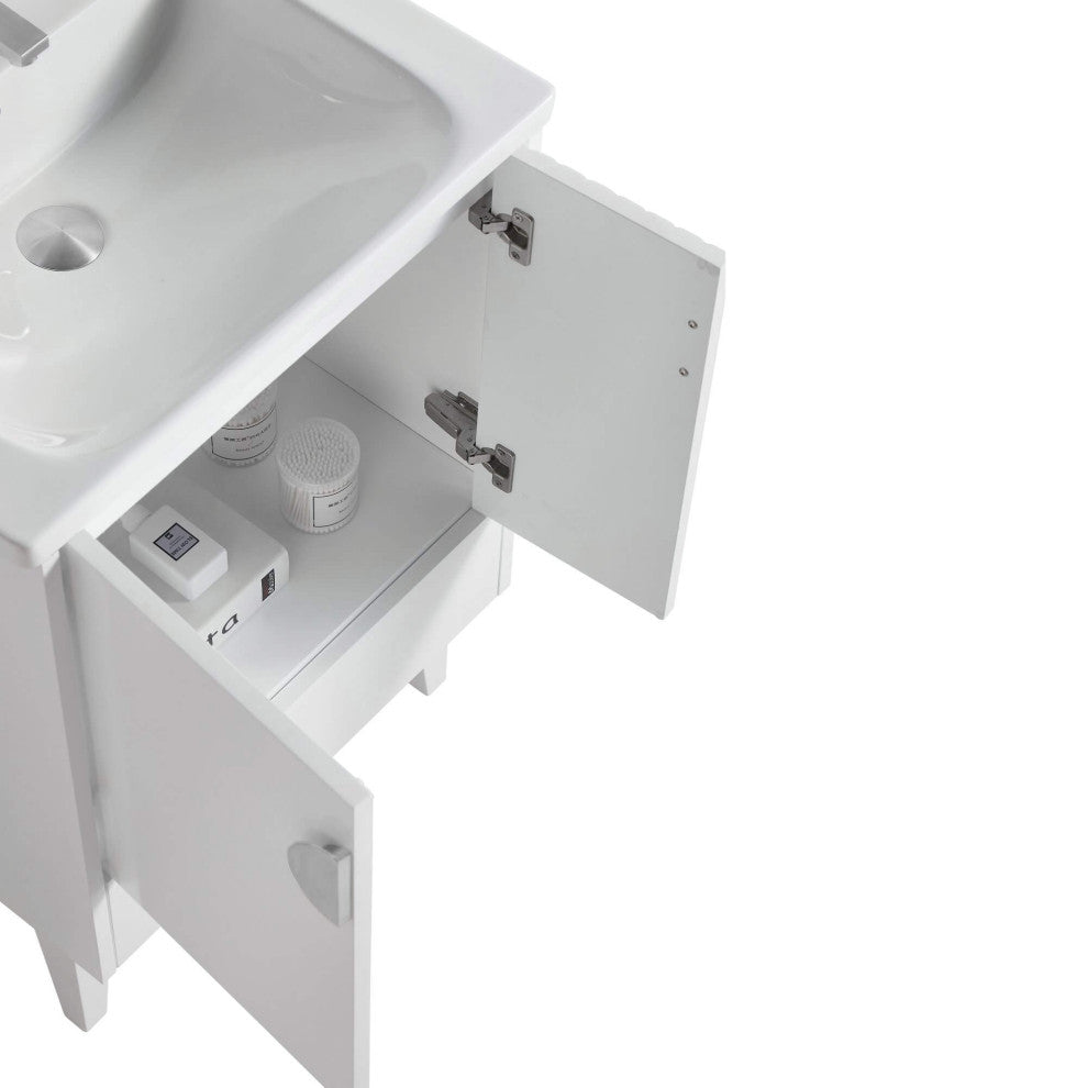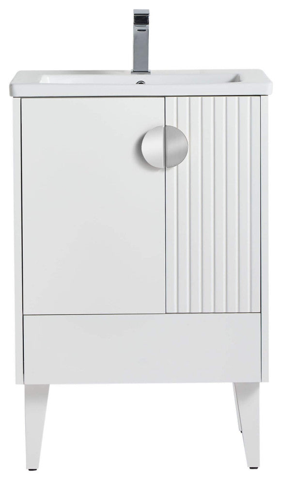 A timeless classic, Venezia merges some of Italy"TMs most glamorous designs with modern trends and architectural updates. Sitting pretty on cone-shaped legs, its squared-in design features an off-center cabinet display, with linear strips in a vertical formation. Modern art in all its glory, Venezia surpasses the ordinary expectations in bathroom vanity performance, brilliantly merging functionality with geometric outlines and a split circular metal opening. Conforms to all transitional, traditional and modern design plans. HEAVY DUTY CONSTRUCTION- Constructed from high quality manufactured wood. Consists of durable plywood with a painted matte finish. Modeled to add beauty & elegance to any bathroom or vanity décor.SINK- Great quality, durable vitreous china material (Ceramic) sink with a glossy water resistant finish for everlasting performance. Features an overflow, yet sleek, prevents water leaks and spills without spoiling its elegance. For your convenience, we have predrilled a single faucet hole- faucet not included VANITY- Spacious Cabinate offer sufficient bathroom storage. They will easily accommodate your essential toiletries and bath items such as soaps, shampoos, shavers, mirrors in addition to your towels. Soft closing Door hinges to avoid slamming. Vanities"TM smooth surface is a prominent factor of its easy to clean attribute.SIMPLE INSTALLATION- Comes assembled out of the box, an approximately 10 minute minor finish up assembly is required. Easy installation, step by step easy to follow clear instruction guide included. All hardware included. Spacious under sink cabinet can be used as easy access for plumbing installation.DIMENSIONS: Height- 33" Length- 18.12" Width-20". Select your favorite option from our variety of sizes and innovative designs. Faucet and Drain And Medicine Cabinet sold separately Model for Faucet FAM3BL and for Drain PU11BL
