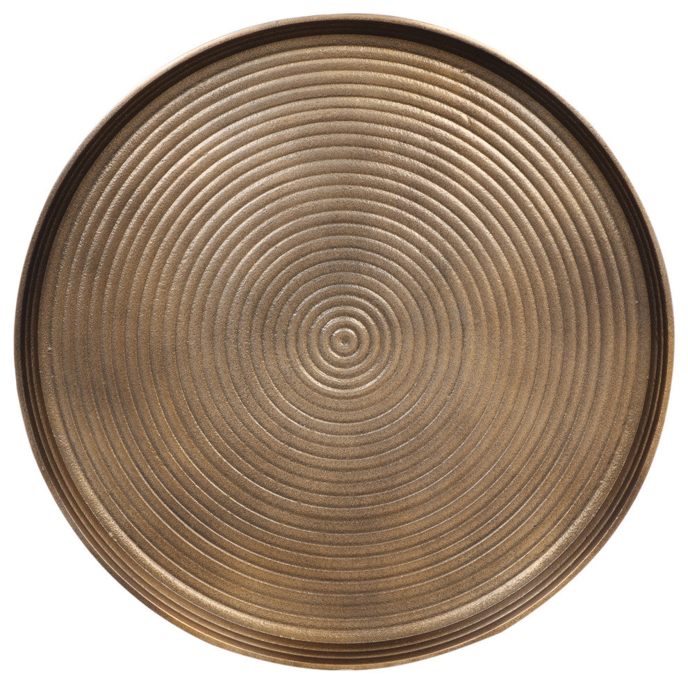 Display your favorite decorative accessories with a handy side table that was made to keep your sofa company. With a smooth aluminum frame and brass finish, this handcrafted piece offers high durability and stunning looks for your home. Perfect as an end table in your living room or bedroom, this piece can be placed in a corner to hold a lovely lamp or a potted plant. Finished with a lipped tabletop and slim tapered legs, this table is a seamless addition to any home.• MODERN DESIGN WITH ANTIQUE FINISH: With clean, precise lines, our accent table is the ideal modern accessory for your interior space. Finished with sleek tapered legs and a concentric tabletop, this table not only offers a refined, minimalistic look but also provides incredible structure. This is completed with an antique metal finish, bringing a classic touch to this piece.• HANDCRAFTED DESIGN: This accessory is expertly designed and handcrafted with artisan expertise. Any natural variations are not product flaws, but rather, will ensure that your purchase is truly a one-of-a-kind product.• ALUMINUM FRAME: This table is built with aluminum, creating a lightweight and stable frame. This material is rust-resistant which will further extend the life of your product.• TAPERED LEGS: This side table showcases three elegantly tapered legs that angle outwards, providing a stable structure. This tripod structure not only offers perfect balance but also accentuates the modern look of the piece.• DIMENSIONS: Choose an accessory that is the perfect size for you and your furniture. This accent table is 19.00" W x 19.00" D x 23.25" H. You will love how much your space can transform with the simple addition of this charming table.• Includes: One (1) Accent TableMaterial: AluminumFinish: Antique BrassHand-Crafted DetailsAssembly RequiredDimensions: 19.00 inches deep x 19.00 inches wide x 23.25 inches high