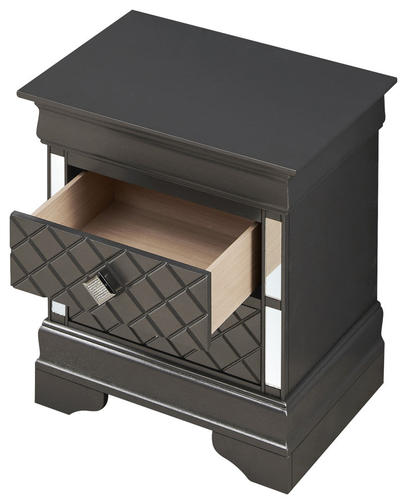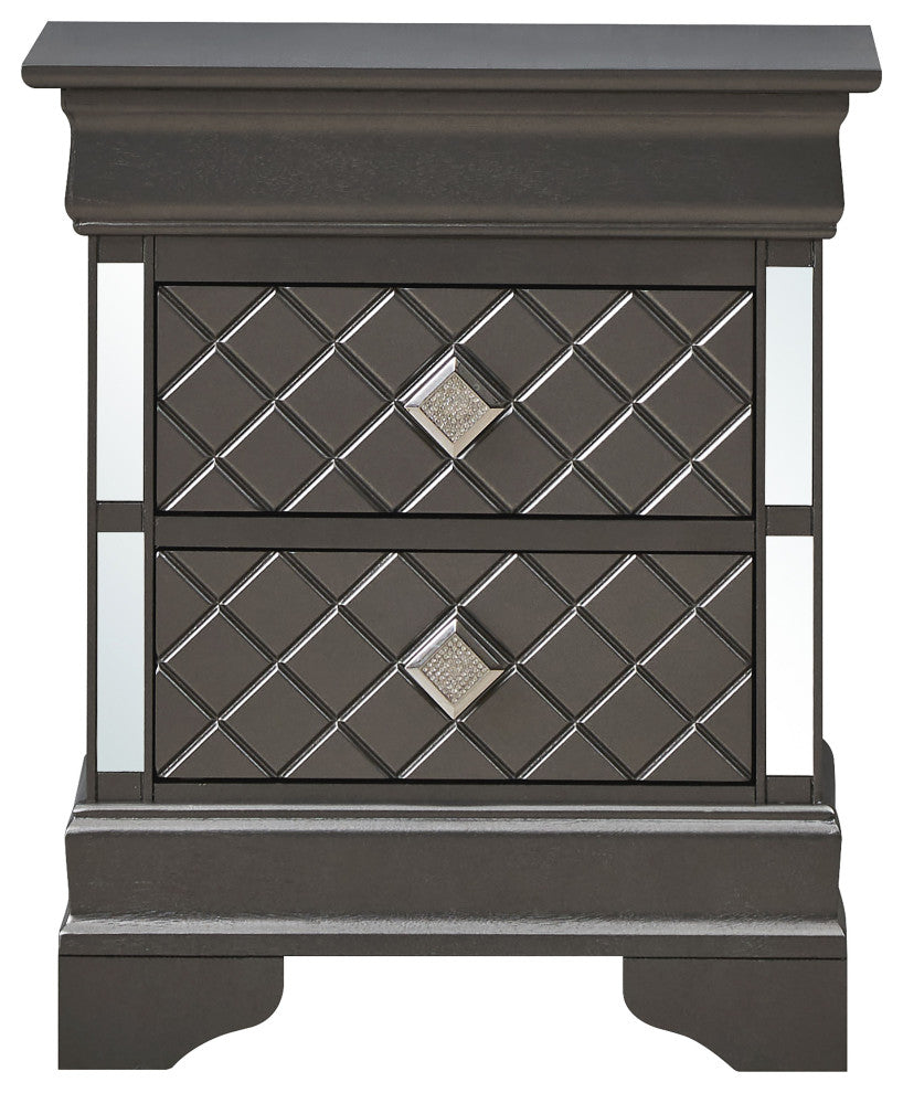 The Verona 2-drawer Nightstand by Glory Furniture works in nearly every space. The embossed diagonal "œX"� drawer-front design and mirror panels add just the right amount of modern style and contrast to a variety of spaces. Use this versatile nightstand as a chairside or bedside table or in a bathroom or entryway.Features• Glamorous style• Arrives fully assembled• Embossed diagonal "œX"� design on drawer fronts• Chrome drawer pulls with decorative faux crystals• Includes one (1) nightstand• Two (2) drawers• Real wood veneer over manufactured and solid wood• Center supports, corner blocks, and metal drawer glides with positive stop• Front and back dovetail construction• Additional coordinating pieces available in the Verona collection by Glory FurnitureDimensions• Assembled Dimensions: 24-inches high X 21-inches wide X 16-inches deep• Product weight 32 pounds