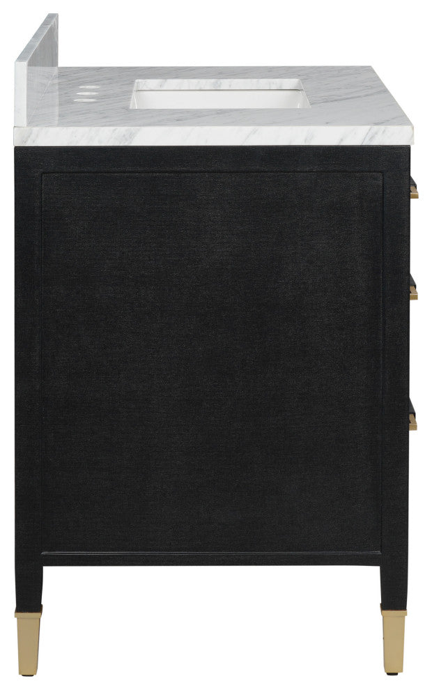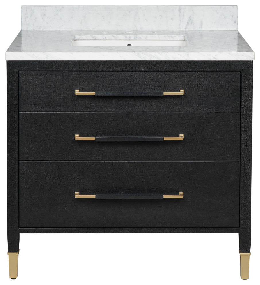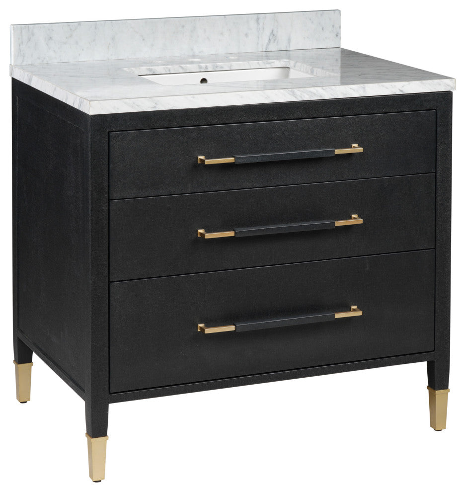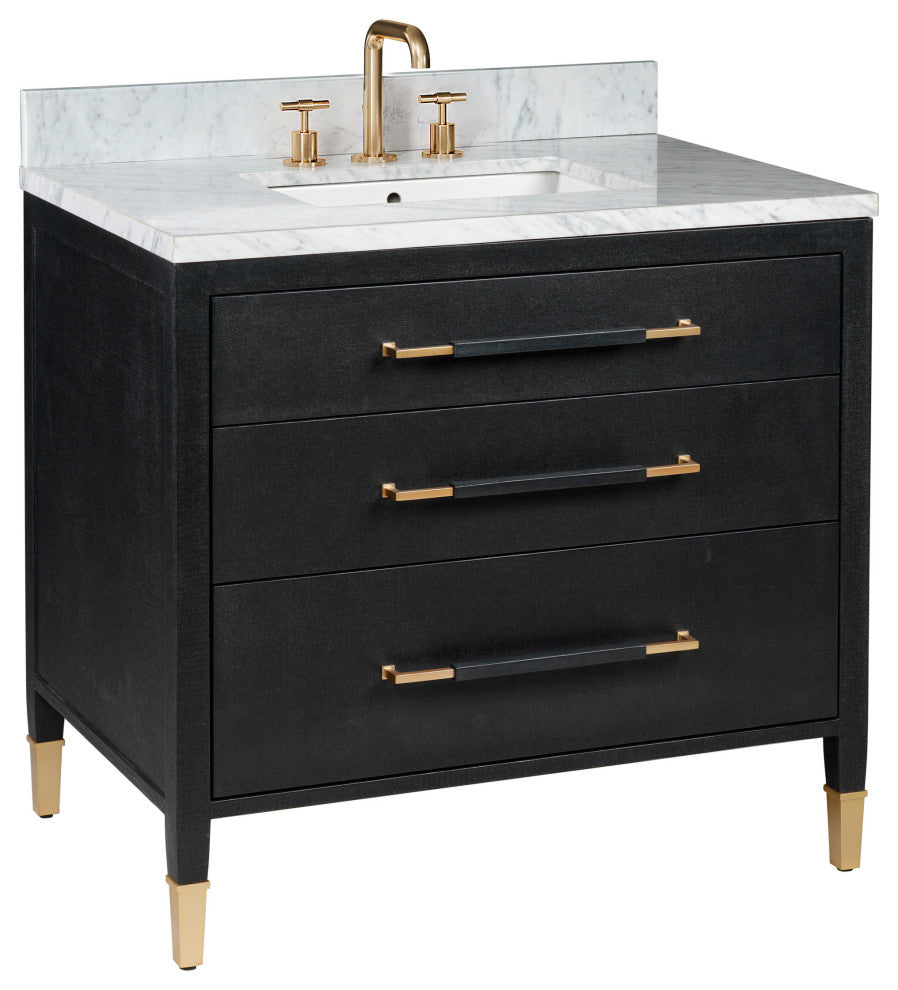 The Verona 36" Black Linen Vanity is covered in black lacquered linen with metal drawer pulls and ferrules in a champagne finish. The vanity has three working drawers, the middle of which has three removable organizational dividers. The white Carrara marble top is fitted with a white rectangular undermount sink. Other fine design attributes include soft-close door hinges and a matching marble backsplash.