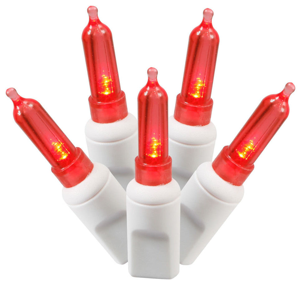 Vickerman 34'' Red Single Mold Italian LED Christmas light set. Add some sparkle to your Holidays with this light strand, featuring 100 Red single mold Italian LED lights on White wire with 4" spacing between bulbs. This light set is end connecting and has the ability to connect to as many as 22 sets. 9.6 watts, .08 Amps. Color box packaging