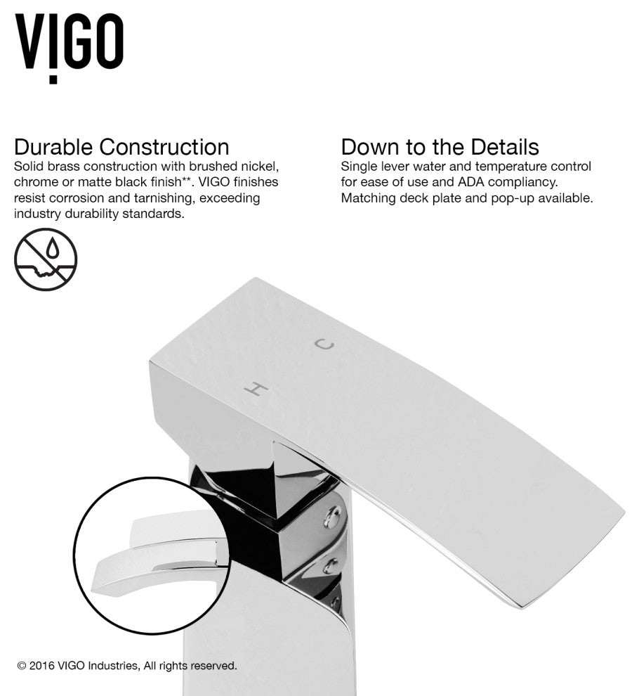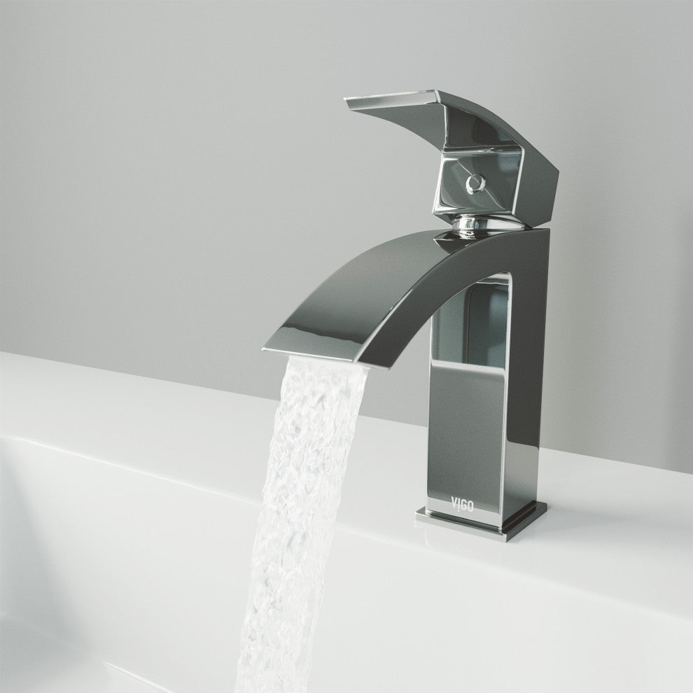 Elevate your bathroom''s aesthetic with the VIGO Satro 1-hole chrome bathroom sink faucet that exudes modern sophistication. This sleek single-handle faucet features a gracefully curved spout that extends 5-in. from the base, providing ample space for comfortable handwashing. Standing at 7-in. tall with a 2-in. diameter, this faucet makes a bold statement without overwhelming your sink area. The ergonomic lever handle offers smooth operation and precise temperature control, while the durable brass construction ensures long-lasting performance. The waterfall-inspired design creates a stunning visual effect as water cascades from the wide spout, adding a touch of luxury to your daily routine. Easy to install and maintain, this faucet is perfect for updating your bathroom''s style. Available in a range of finishes including Brushed Nickel, Chrome, Matte Black, and Matte Brushed Gold, this versatile faucet complements various decor styles from contemporary to transitional, making it an ideal choice for any bathroom renovation or new construction project.Features:• SINK COMPATIBILITY:�Our bathroom faucet collection is designed specifically for all sink types, EXCEPT vessel sinks; for vessel sink compatibility, please refer to the VIGO Vessel Faucets collection.;• SLEEK MODERN DESIGN: Elevate your bathroom with this 7-in. H chrome bathroom faucet''s striking waterfall design. The gracefully curved spout and clean lines create a contemporary aesthetic that complements any decor style.;• EASY INSTALLATION: Designed for hassle-free single-hole mounting, this faucet ensures a quick and simple setup.;• PERFECT FIT: With an overall height of 7-in. and a spout reach of 5-in,this bathroom faucet strikes the ideal balance between presence and practicality, complementing a wide range of sink sizes and styles.;• WATER-SAVING TECHNOLOGY: Equipped with a 1.2 GPM flow-optimizing aerator, this single-hole faucet reduces water consumption without compromising performance. Enjoy a steady, splash-free stream while conserving resources and lowering utility bills.;• DURABLE CONSTRUCTION: Crafted from high-quality materials, this bathroom sink faucet resists corrosion, tarnishing, and daily wear. Its solid brass body ensures long-lasting performance and maintains its elegant chrome finish.;Measurements:• Assembled Depth: 7";• Assembled Height: 7";• Assembled Width: 2";Details:• Sleek chrome faucet with curved spout and square base;• EternalSealTM cartridge lasts 3X longer than industry average;• Eco-Faucet Exceptional performance with a powerful 1.2 GPM flow;Certifications&Warranty: