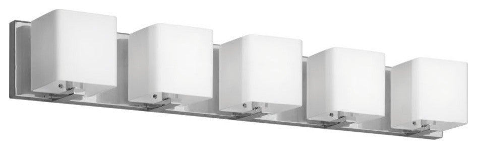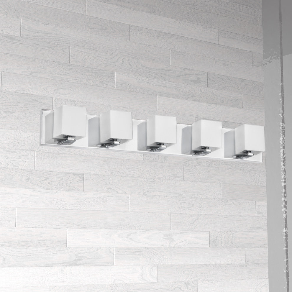 Brighten your bathroom or vanity area with the 5-Light White Opal Vanity Fixture. Featuring electroplated steel with frosted white glass shades, this light is sleek and sophisticated. Display it among pieces of modern decor for a cohesive feel.