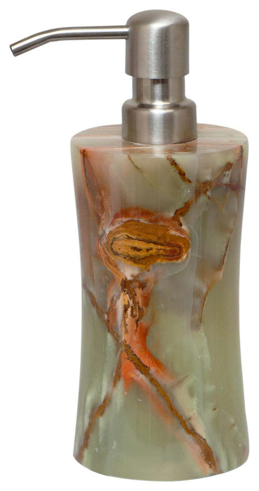 Our Vinca Whirl Green Onyx Soap Dispenser is a sophisticated and chic accessory for your bathroom or kitchen countertop. Match the existing hardware in your space by selecting this tasteful piece with either a brushed silver or gold pump dispenser.