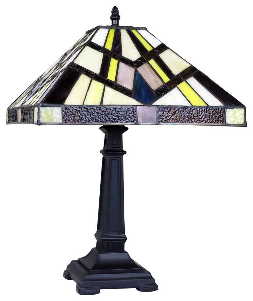 Vincent is a beautiful Mission-style, stained glass table lamp, featuring a hand-made shade and a blackish bronze base. This lamp would be perfect on a bedside table, in the foyer, and living room. The handcrafted shade is made using the same methods developed by Louis Comfort Tiffany in the early 1900s. This process entails using 164 hand-cut stained art glass pieces each wrapped in fine copper foil and soldered together at extremely high temperatures to form each unique piece. The exact size to the nearest inch may vary, and the exact color of each glass piece may vary due to each piece being handcrafted. The first image is with the light shining through, the second image is with no light. Dry listed and recommended for an indoor setting.
