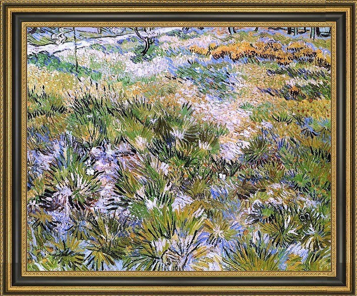 20" x 25" Vincent Van Gogh Meadow in the Garden of Saint-Paul Hospital framed premium canvas print reproduced to meet museum quality standards. Our Museum quality canvas prints are produced using high-precision print technology for a more accurate reproduction printed on high quality canvas with fade-resistant, archival inks. Our progressive business model allows us to offer works of art to you at the best wholesale pricing, significantly less than art gallery prices, affordable to all. This artwork is hand stretched onto wooden stretcher bars, then mounted into our 3 3/4" wide gold finish frame with black panel by one of our expert framers. Our framed canvas print comes with hardware, ready to hang on your wall. We present a comprehensive collection of exceptional canvas art reproductions by Vincent Van Gogh.