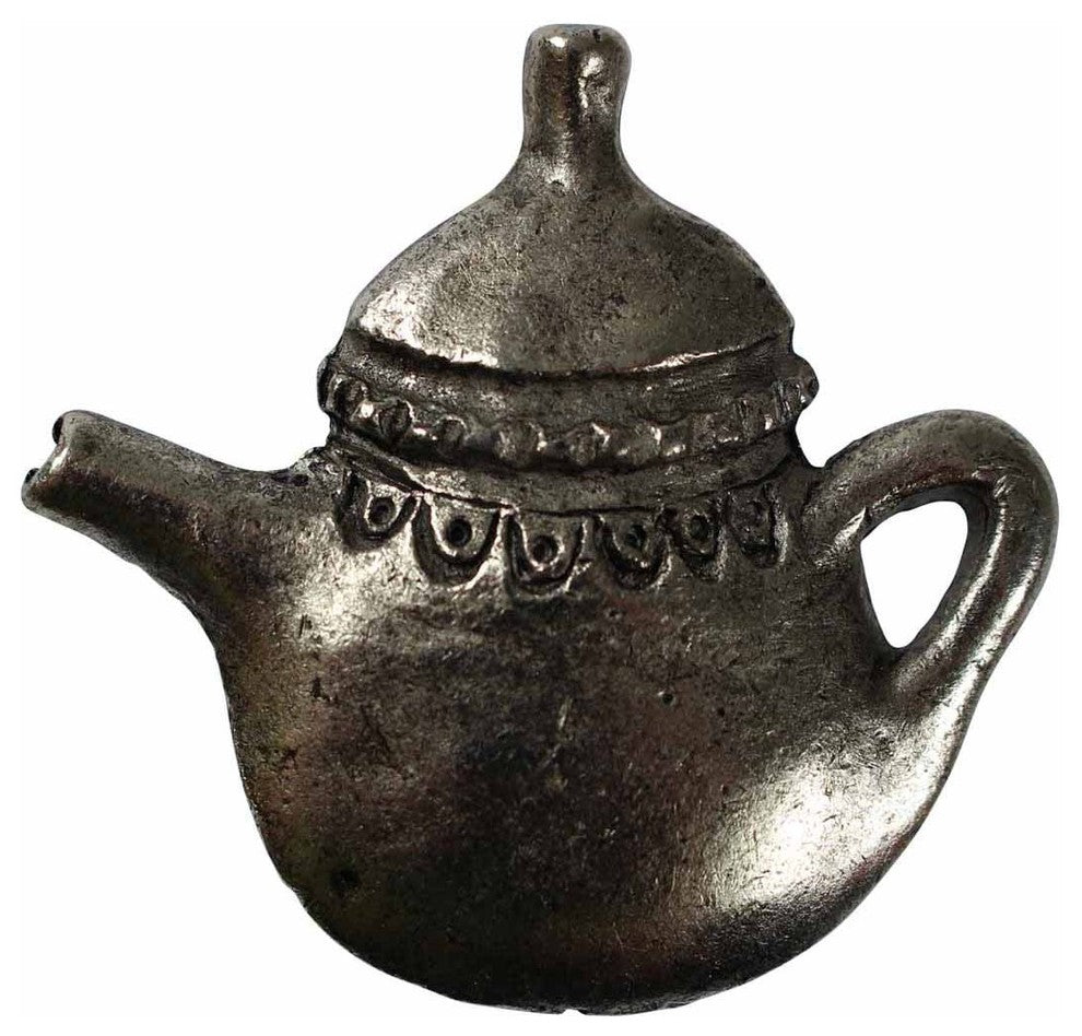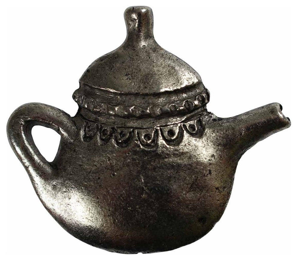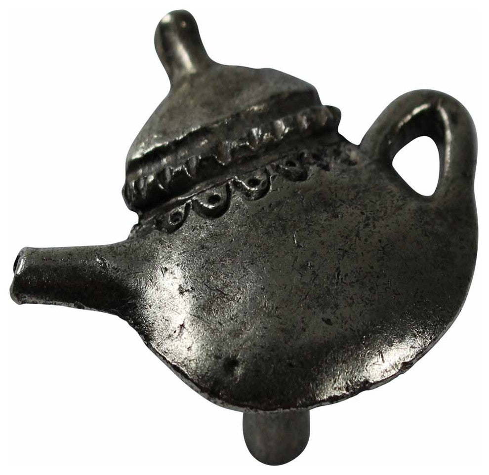 Item 20653 Tea-time! These teapot cabinet knobs measure 1 3/4" long, 2"wide and project 1". Solid Brass with an Antiqued Silver finish.