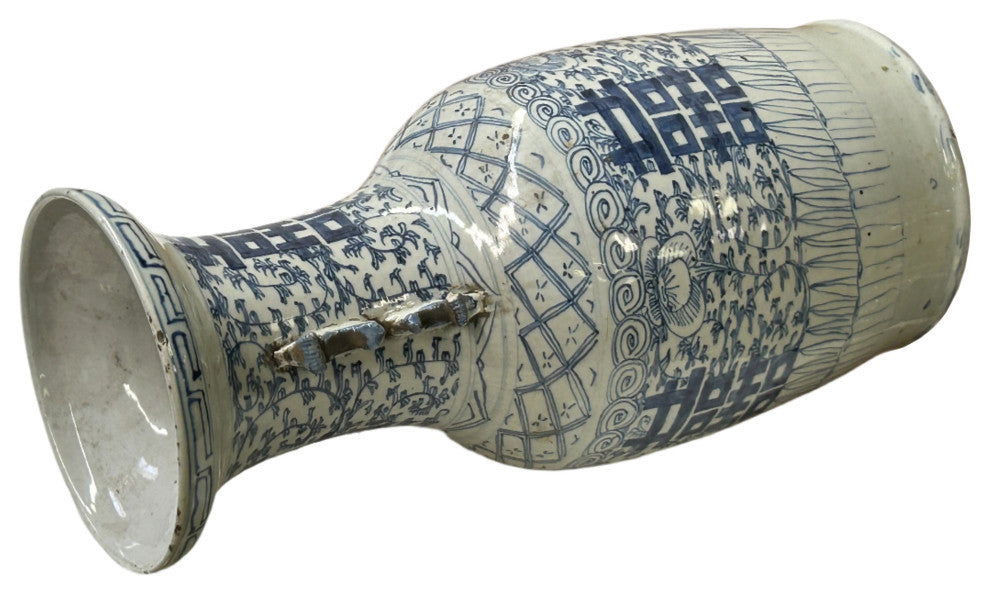 This vintage Chinese porcelain vase is a testament to the artistry and craftsmanship of traditional Chinese ceramics. Decorated with intricate blue and white designs, including auspicious symbols and calligraphy- double happiness , this vase is a visual feast for the eyes. The elegant shape and rich glaze create a timeless piece that adds a touch of sophistication and cultural richness to any space. Whether used as a decorative accent or to showcase a beautiful floral arrangement, this vase is sure to be a treasured addition to your home or collection.Dimensions: Dia 8" x h17"Origin: ChinaMaterial: PorcelainCondition: Handmade, vintage style finish, original marksUSA domestic continental buyers of 48 states pay $80 shipping (buyers of Hawaii, Alaska, US Islands, Florida Keywest, and Canada pay the extra shipping cost). Insurance and handling charges are already included in the shipping cost. In-store pick up is highly welcomed if you are in San Francisco Bay Area. (No charge)