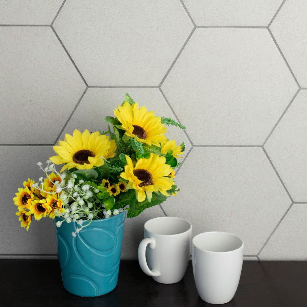 Offering a cement look, our Vintage Hex Blanco Porcelain Floor and Wall Tile features a slightly textured, satin finish, providing decorative appeal that adapts to a variety of stylistic contexts. Containing 4 different print variations that are randomly distributed throughout each case, this white hexagon tile offers a one-of-a-kind look. With its impervious, frost-resistant features, this tile is an ideal selection for both indoor and outdoor commercial and residential installations, including kitchens, bathrooms, backsplashes, showers, hallways, entryways, patios and fireplace facades. This tile is a perfect choice on its own or paired with other products in the Vintage Collection. Tile is the better choice for your space!