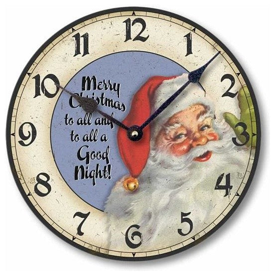 A classic 1950s style Santa Claus bids Merry Christmas to all and to all a good night from the face of this delightful holiday clock. Makes a charming seasonal Christmas decoration or a useful and lasting gift. Clock hands have a distressed finish.