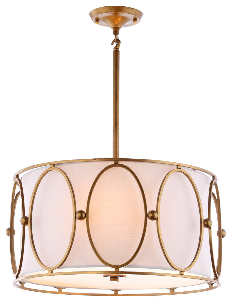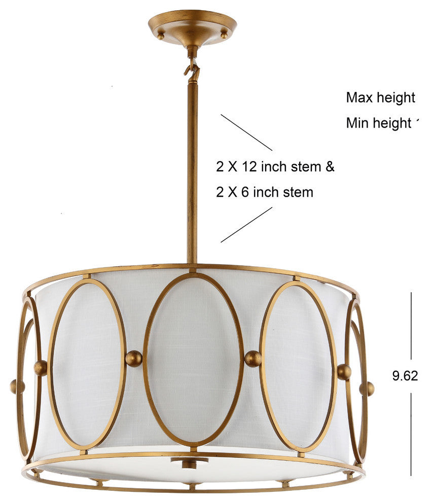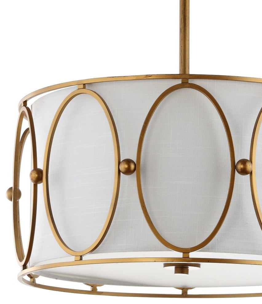 A hoop and ball design artfully adorns this feminine pendant in linen and gold-leafed metal. The rod delicately hooks to the ceiling canopy and can range from 19" to 49" in drop depending on how many rods you use. The plastic cord is easily connected to your home''s electrical grid by a licensed electrician. -A feminine pendant for transitional interiors-100% cotton hardback drum shade in white-Hardwired electrical connection must be installed by a professional electrician-Eco-friendly 4W LED bulb included-Takes three bulb and compatible with any type "A" 60 watt incandescent, 13 watt CFL, or 9 watt LED Color: Gold with white shade-Body Material: Metal-Includes: One (1) lamp(s)Assembly RequiredLamp: 19.5-49.5 inches high x 19 inches wide x 19 inches deepAbout us: You see a lamp.We see a decorative work of art.A perfectly curved shade casts a dramatic shadow on a floor. A silk cord you never want to hide. LED lightbulbs: as easy on the environment as they are on the eyes. The JONATHAN Y Lighting collection considers every detail from impeccably sourced materials to designer styling. And our prices are so attractive, we''ve transformed a functional necessity into a fashion accessory.JONATHAN Y Lighting - a fashion revolution in home decor.