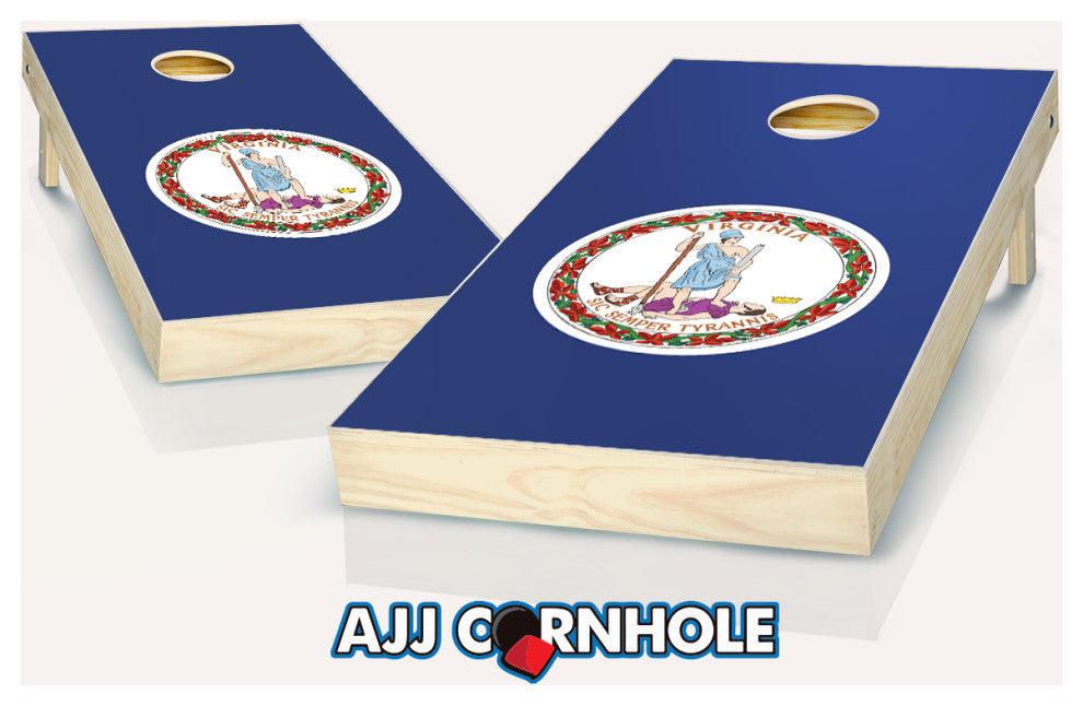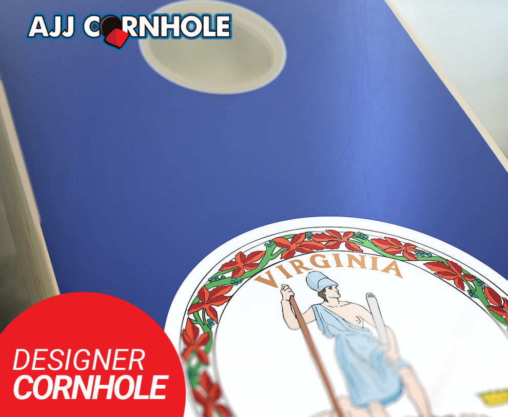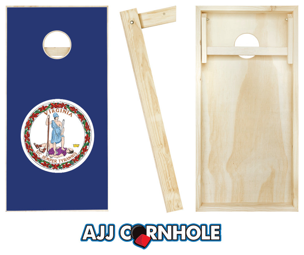 This top of the line Virginia Flag Cornhole Set is sure to bring life to any party! Set comes ready to play with 4 red and 4 royal blue cornhole bags. All sets are made using a premium 2x4 frame and 1/2" sanded plywood playing surface. Each set has folding 2x4 legs secured with galvanized bolts.