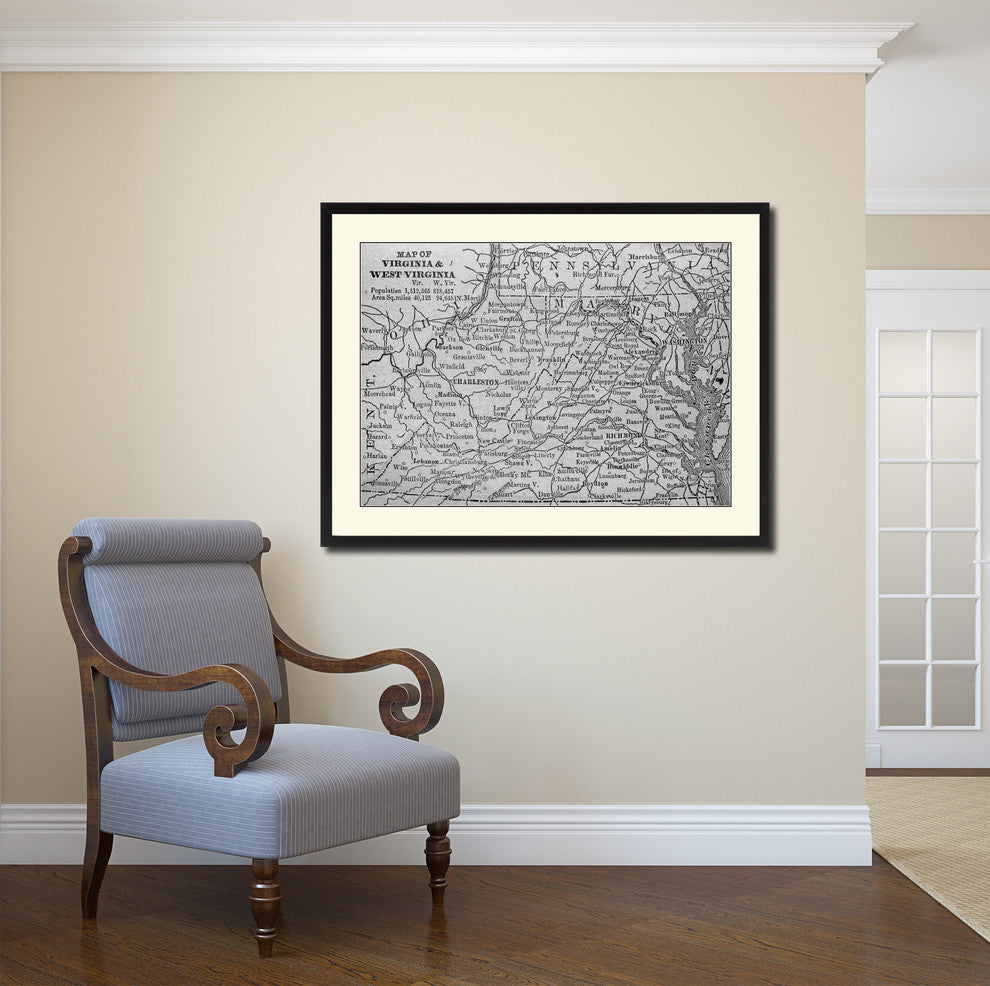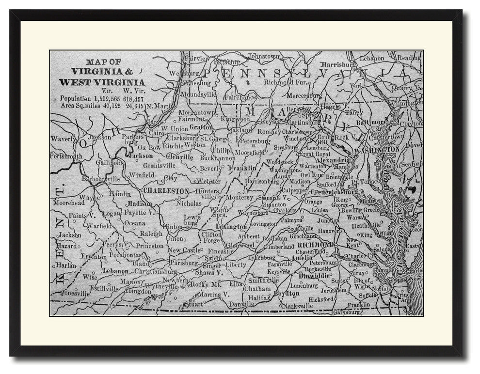Virginia West Virginia Vintage B&W Map Canvas Print, 28"x37"