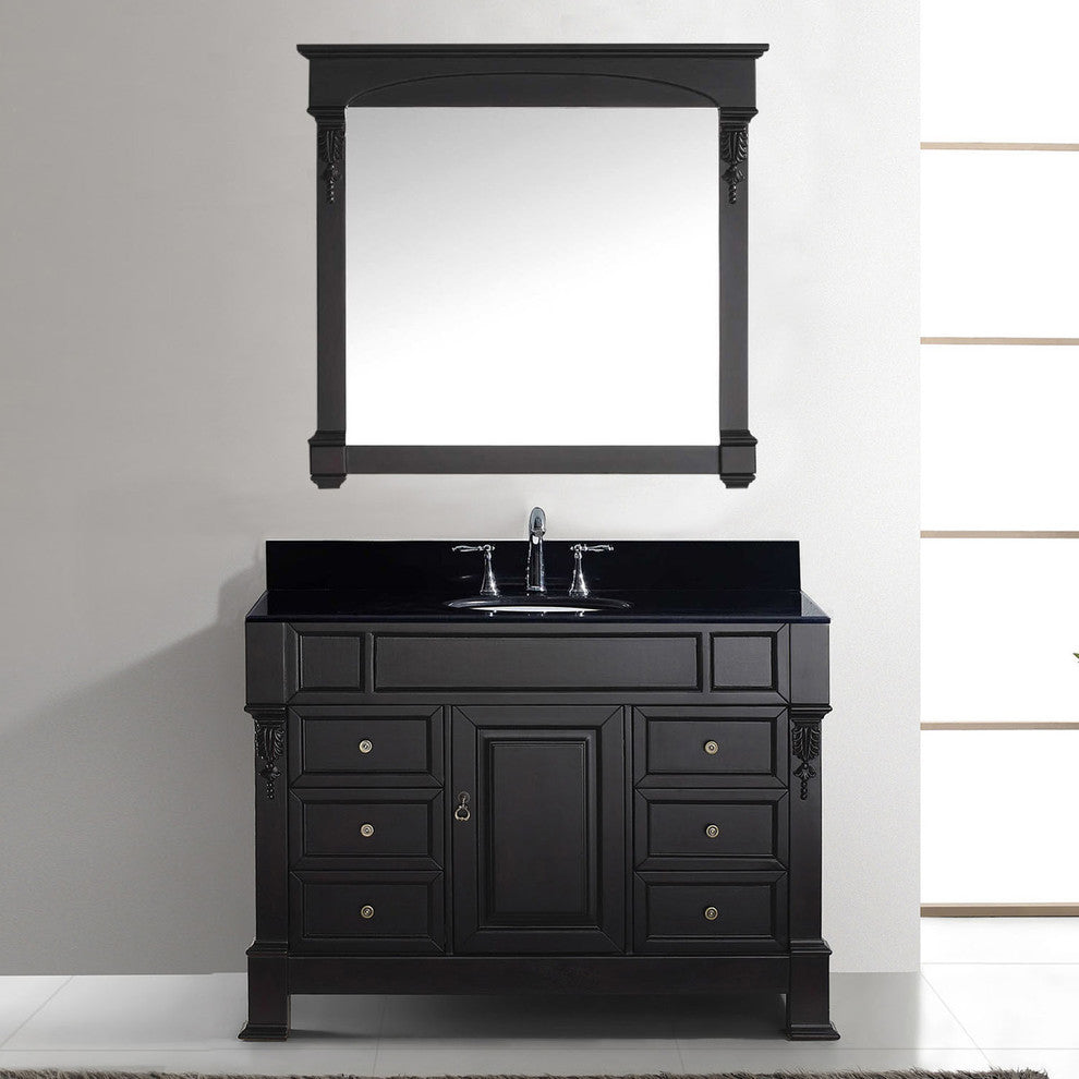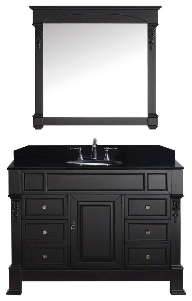 The Huntshire Manor makes a bold statement with defining straight lines and strong features. It offers a spacious storage space and gorgeous marble top. The Huntshire Manor is the perfect vanity for anyone who finds beauty in traditional class. Virtu USA has taken the initiative by changing the vanity industry and adding soft closing doors and drawers to their entire product line. The premium soft-closing hardware not only increases the safety of the vanity, but also its lifetime reliability.Materials: Black Galaxy, Brass HardwarePurchase Includes: Single 37.8" x 35.8" MirrorBlack Galaxy CountertopWhite Round Basin, No Faucet