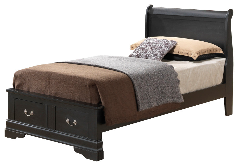 This Classic Design Wood Sleigh Storage Bed Adds Graceful Lines and Styling to Your Bedroom. Also Included are Storage Drawers in the Footboard. Made with Dovetail Joinery you can be assured of Durability and Quality. Available in Twin, Full, Queen and King, it also can be ordered in Many Different Finishes. Matching Dressers, Chests, Nightstands and Mirrors are also Available.