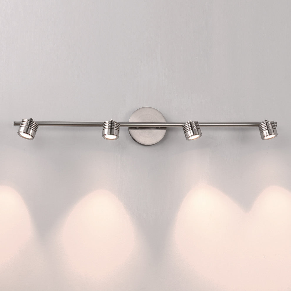 Vector LED 4 Light Fixed Rail in Brushed NickelStylish cylindrical rail heads accent this beautifully crafted rail kit. 33W LED Track Pack includes 34" track and mounting components in designer finishes with 4 stunning LED track luminaires. This is the perfect solution for affordable and stylish LED downlighting in a ceiling or bath & vanity application. Individually Adjustable Heads, fixture can be wall or ceiling mounted.CEC Title 24 Compliant, and Energy Star Rated.Driver located in Junction box.Universal Voltage Input (120V - 277V), Dimming: ELV (120V) or 0-10V. Smooth and continuous dimming with an ELV or 0-10V dimmer.High Powered LED: 60,000 Hours Rated Life, High 90 CRI, Color Temp: 3000K. Performance: 1500 Lumens, 1465 Delivered, 33Watts.Standards: ETL & cETL Damp Location Listed.Location: DampHardwired or Portable:HardwiredEnergy Star:YesBulb Type: LEDNumber of Bulbs: 4Watts Per Bulb: 8.25Bulbs Included: YesLight Assembly Required