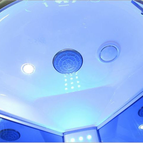 36" Walk In Steam Shower- Corner UnitMesa 9090K3KW Steam Generator•  6 Body Jets•  Multifunctional Handheld Shower Head•  Rainfall Shower Head•  FM Radio Built-In•  Blue Tinted Glass110V ETL certified•  Overhead LED Lighting•  Ventilation Fan•  Foldable Center Seat•  Ozone Sterilization System•  Digital Timer and Temperature Control•  Storage Shelves•  Fluorescent Blue Mood Lighting