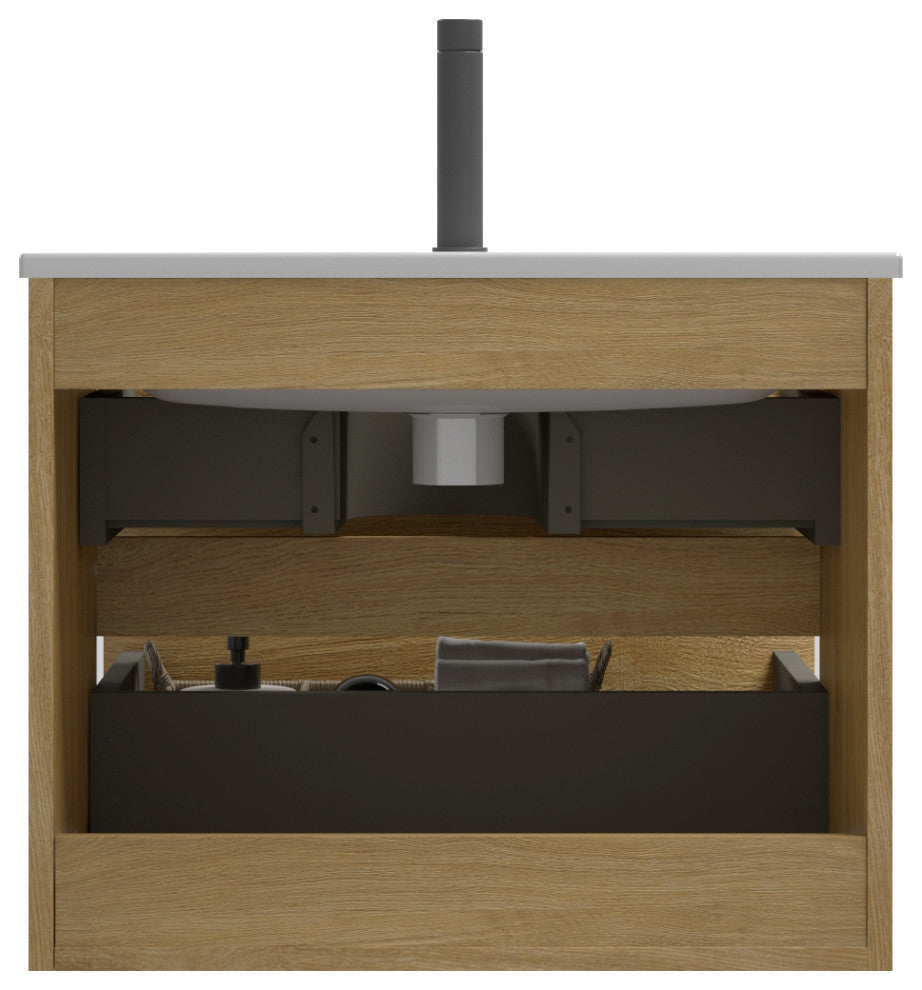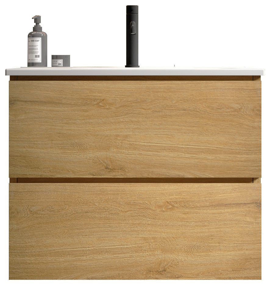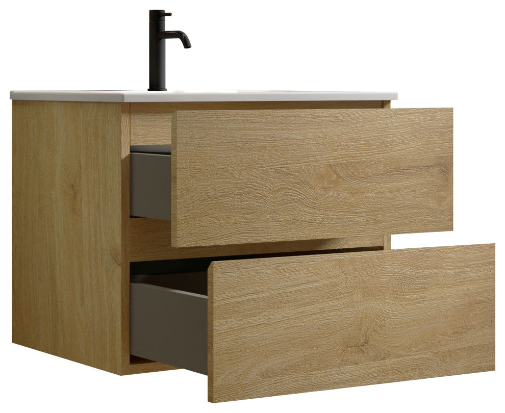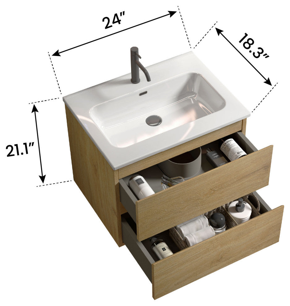 Wall-Mounted Bathroom Vanity Set with Ceramic Sink with one faucet hole, Oak