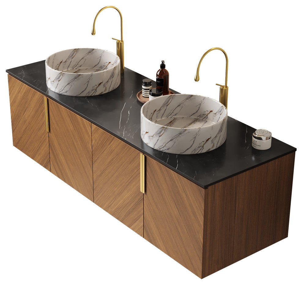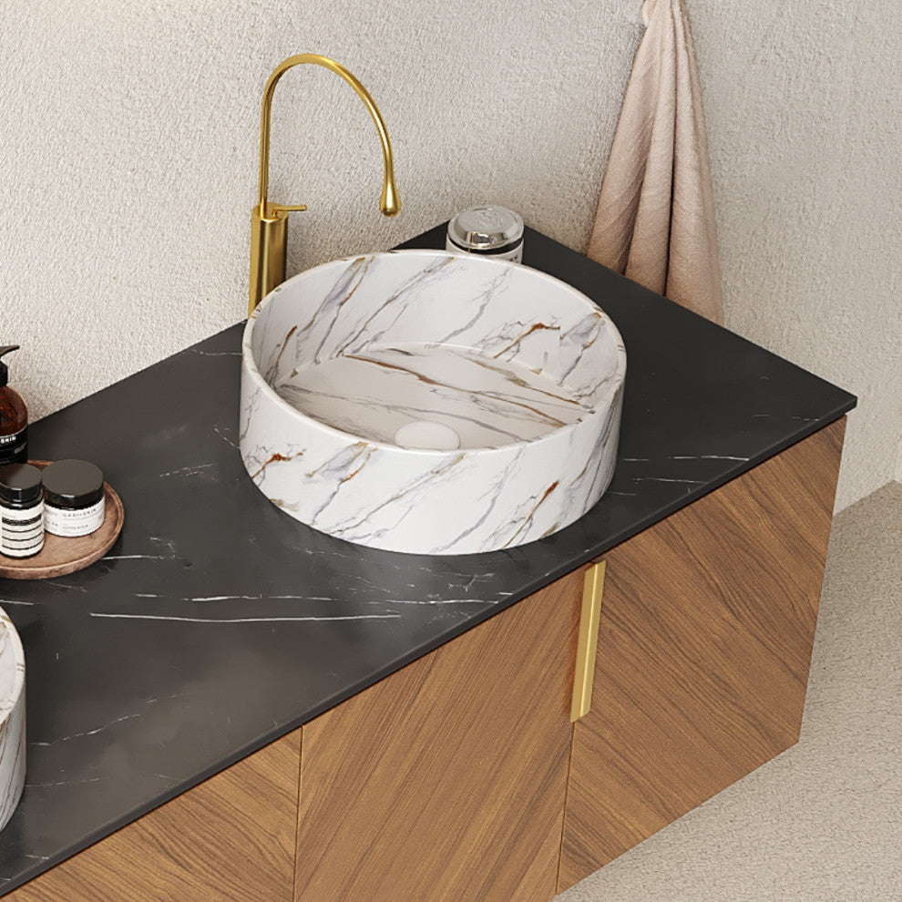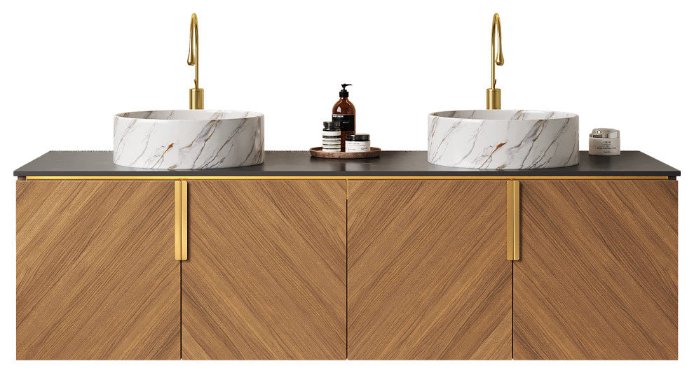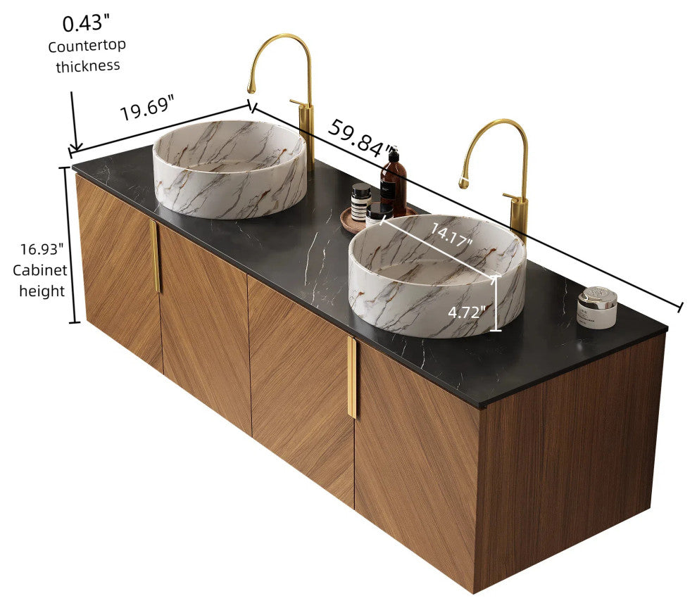 [Two Types of Basins Are Available]We offers two exquisite ceramic basins for your choice: a white round basin with stone patterns or a black bowl-shaped basin with stone patterns. Both feature hazy gray veined textures that echo the black sintered stone countertop with marble patterns, creating an atmosphere of grandeur and stability. (Please note that due to the natural textures of the stones, the texture of each countertop is unique.)The basin has excellent durability and stain resistance, easy to maintain, standing up to long-term use. Please be noted that faucet mounting hole size :1.38'''', the height of faucet spout ≥9'''' is recommended. The sink drain stopper without overflow hole is recommended.[Brown Oak Grain Finish Cabinet with Diagonal Design]The cabinet is finished with a brown oak grain, and the door panels of the cabinet feature a unique and distinctive design of symmetrical diagonal textures. The brushed gold handles, crafted from high - quality metal, shine with a charming luster.The cabinet is made of high-quality plywood, it has excellent water and moisture resistance to ensure that not easy to be deformed or moldy even in a humid bathroom environment.[Large Storage Space and Soft Close System]The double-door design of this storage cabinet creates a larger storage space within the cabinet, allowing you to store bathroom items of various sizes.The cabinet door has a built-in cabinet soft-close damper to ensure that the door closes quietly and smoothly without making loud noises.[Easy to Assemble]This bathroom cabinet comes in flat-pack form and requires you to assemble it by yourself. However, rest assured that we have prepared a detailed and easy - to - understand installation manual for you. The entire installation process doesn''t involve complicated steps or rely on professional skills. You can quickly complete the assembly of this bathroom cabinet just by the install steps.This bathroom vanity is available in Two sizes (30"/60") to satisfied the different families and bathrooms.