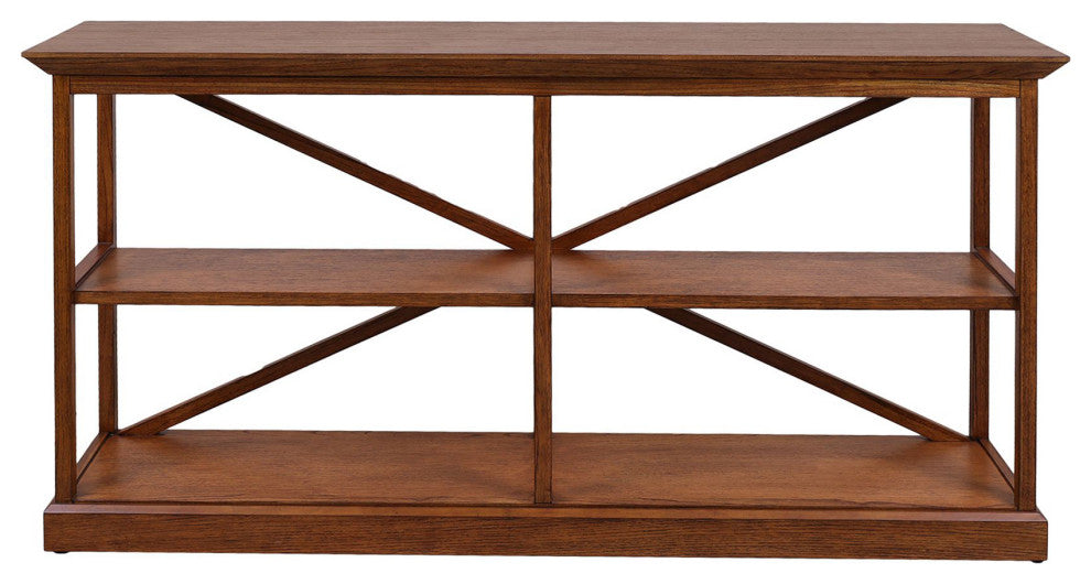 Add a blend of style and functionality to your home with this elegant console/sofa table. Crafted from Mindi wood and white oak veneer, it boasts a warm brown finish that enhances its natural wood grain. The open design features a spacious fixed shelf, perfect for displaying decor or storing essentials. The clean-lined structure, supported by sturdy crossbeam detailing, adds a modern yet rustic touch. Equipped with floor levelers for stability, this piece is ready to use straight out of the box