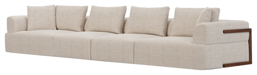 The Warner Sofa Collection offers a contemporary blend of modern design and premium craftsmanship. Upholstered in a thick, semi-rough textured woven fabric in premium Oatmeal Performance Fabric, its corner is cradled by a smooth luxe walnut wood frame with a medium-dark brown finish for a complementary contrast. The low backrest is paired with oversized, high pillows, creating a relaxed, inviting aesthetic with an intentional gap between the cushions for a casual and modern touch. With its oversized feel and wood frame elegantly wrapping around the corners, this sofa collection combines style, comfort, and durability for any living space.