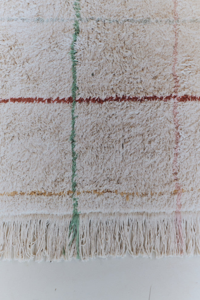 This is a unique artisan piece, sustainably handcrafted in our own factory using natural fibers and upcycled materials, non-toxic dyes, and a firm commitment to the planet and people. From the design process, to material sourcing and production, we always choose options that minimize waste and ensure long-lasting designs. Rectangular natural rug with lines in different colors, finished with short fringes at the edges.