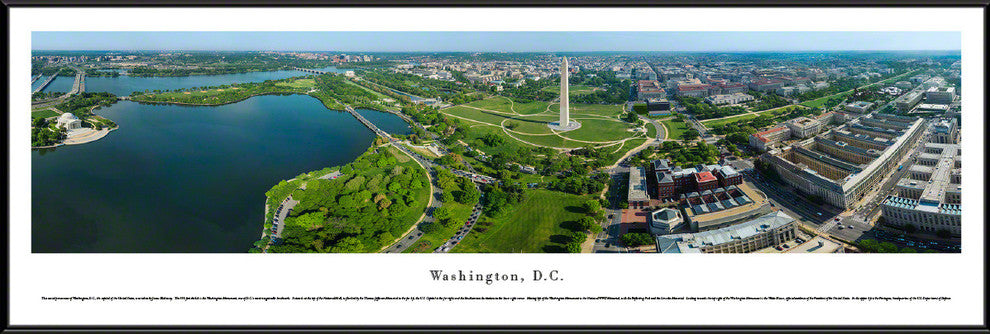 This aerial panorama of Washington, D.C., the capital of the United States, was taken by James Blakeway. 555-foot obelisk is the Washington Monument, one of D.C''s most recognizable landmarks. It stands at the top of the National Mall, is flanked by the Thomas Jefferson Memorial to the far left, the U.S. Capitol to the far right and the Smit''sonian Institution in the lower right corner. Moving left of the Washington Monument is the National WWII Memorial, with the Reflecting Pool and the Lincoln Memorial. Looking towards the top right of the Washington Monument is the White House, official residence of the President of the United States. In the upper left is the Pentagon, headquarters of the U.S. Department of Defense.