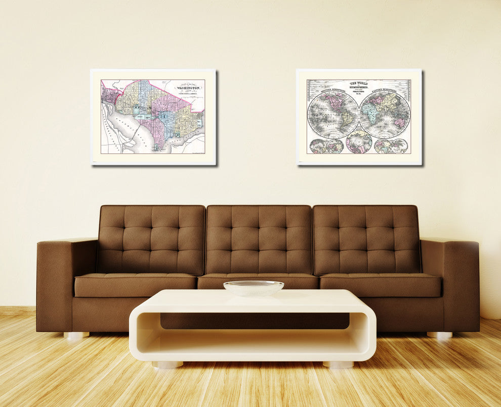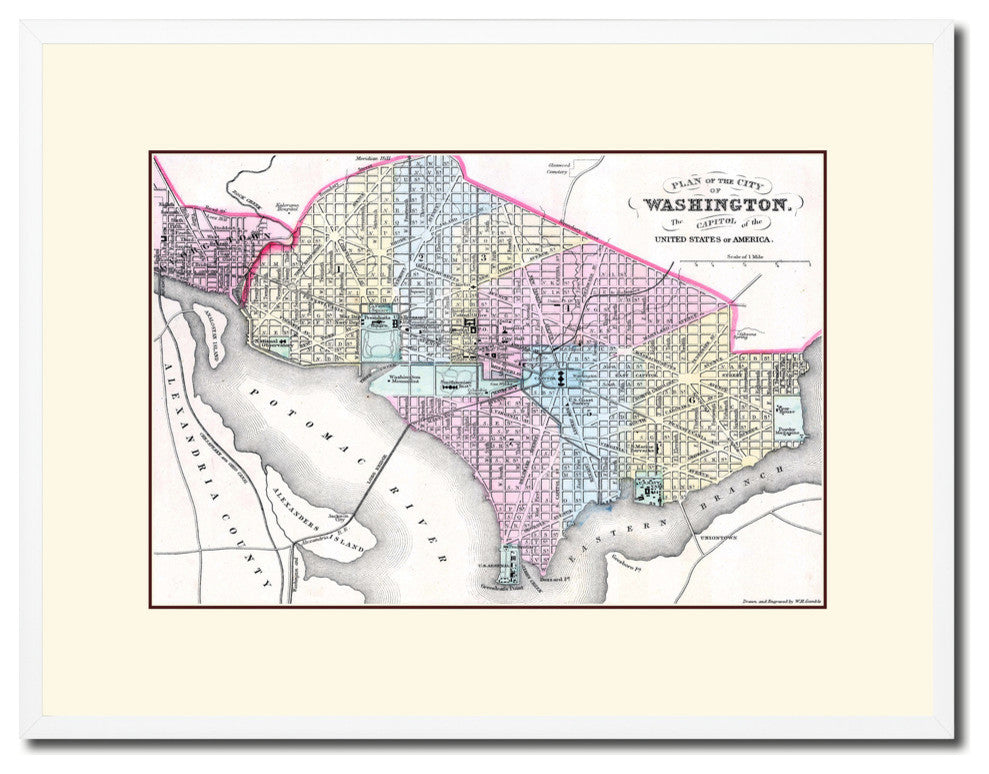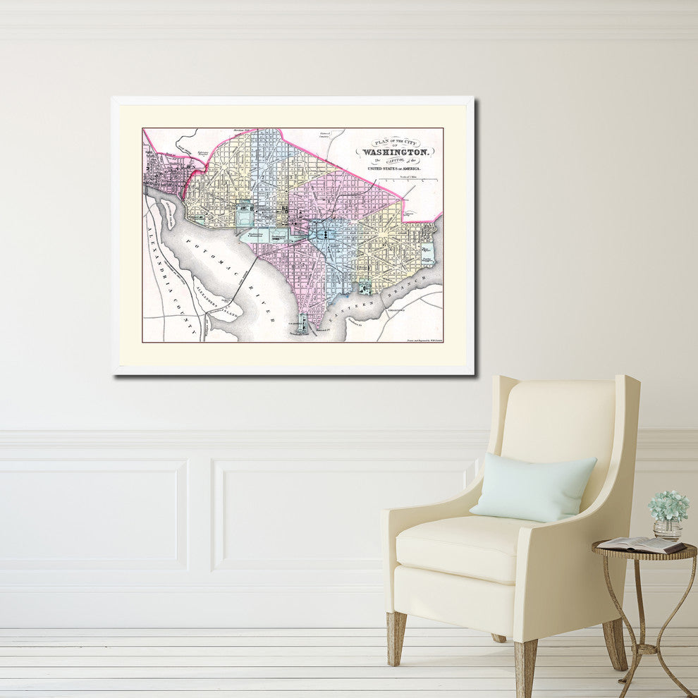 Washington DC Old Map Print On Canvas With Frame Art Collection 16" X 21"