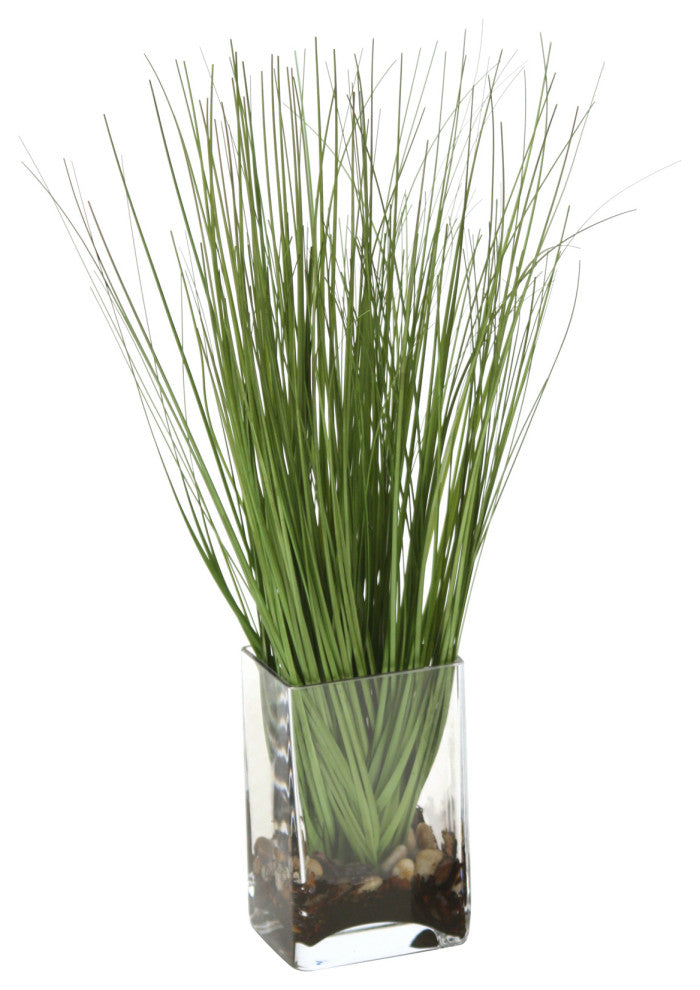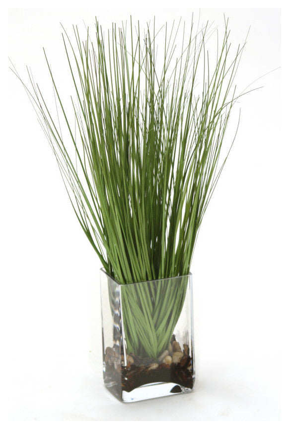 Elegant artificial Waterlook® Grass in Rectangular Glass.• Waterlook® is the exclusive process for achieving the illusion of fresh-cut flowers in water in clear glass.• Waterlook® cures to a smooth, non-sticky finish so dust does not adhere to its surface and is a registered trademark of Distinctive Designs International, Inc.• Although "silk" is a common term used to describe artificial flowers and foliage, the floral designs are actually made of materials that have more durability and do not fray or fade as silk does. Each bloom, leaf, and stem is individually wired to maintain realistic form, while the subtle colorations, shadings, and striations in the natural flower are duplicated to perfection!• Made in the USA of imported and/or domestic components. Each floral is handcrafted by a single designer, not mass produced. Production lead-time from receipt of order to shipment is normally 10-12 business days.• All product dimensions are approximate because each arrangement is individually hand-crafted of artificial floral components that are themselves wired and "arrange-able". So each is truly one-of-a-kind, a professionally arranged floral, not form mold assembly line design.• Treat Waterlook® florals the same as you would fresh flower arrangements. Avoid exposure to direct sunlight or extremes of heat or cold. Exposure to intense UV rays could cause eventual discoloration.• Cleans easily with a duster or dryer on cool setting.• No assembly or "fluffing" required. Arrives ready for display.