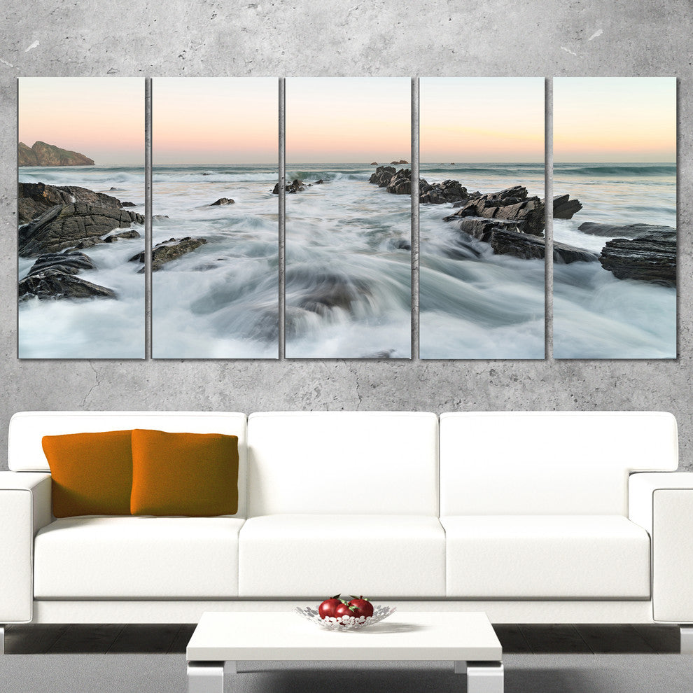 "Waves Hitting Beach At Sunrise Atlantic" Seascape Wall Art, 5 Panels, 60"x28"