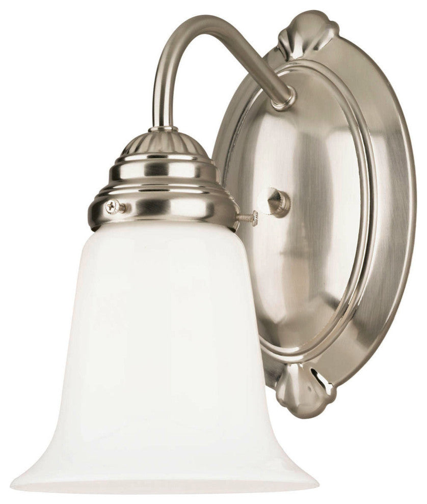 Highlights: 1 lightUse one clear standard base bulbWidth: 4-7/8", height: 8-3/4", extends: 7-5/8"R-20 fan/vanity 50 watt max,A-19 or B13 60 watt maxBrushed nickel finishOpal glassBoxed