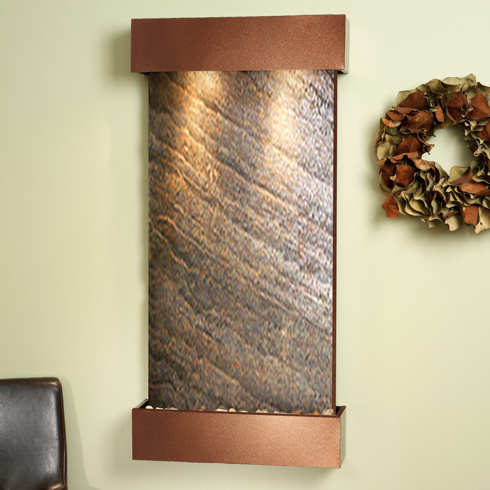 The beautiful Whispering Creek Water Fountain is not only a flowing piece of artwork, but also extends its soothing effect on all who hear it. This smaller vertical wall water fountain is easy to install in any room in your home today. It comes in a variety of metal trim and water surface options to easily match any decor. Start relaxing in your home with your own indoor water fountain now.