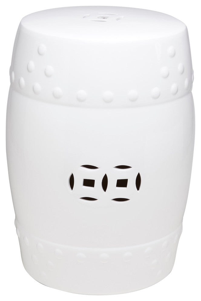 Ceramic white finish round top garden stool. Double pierced medallion design.
