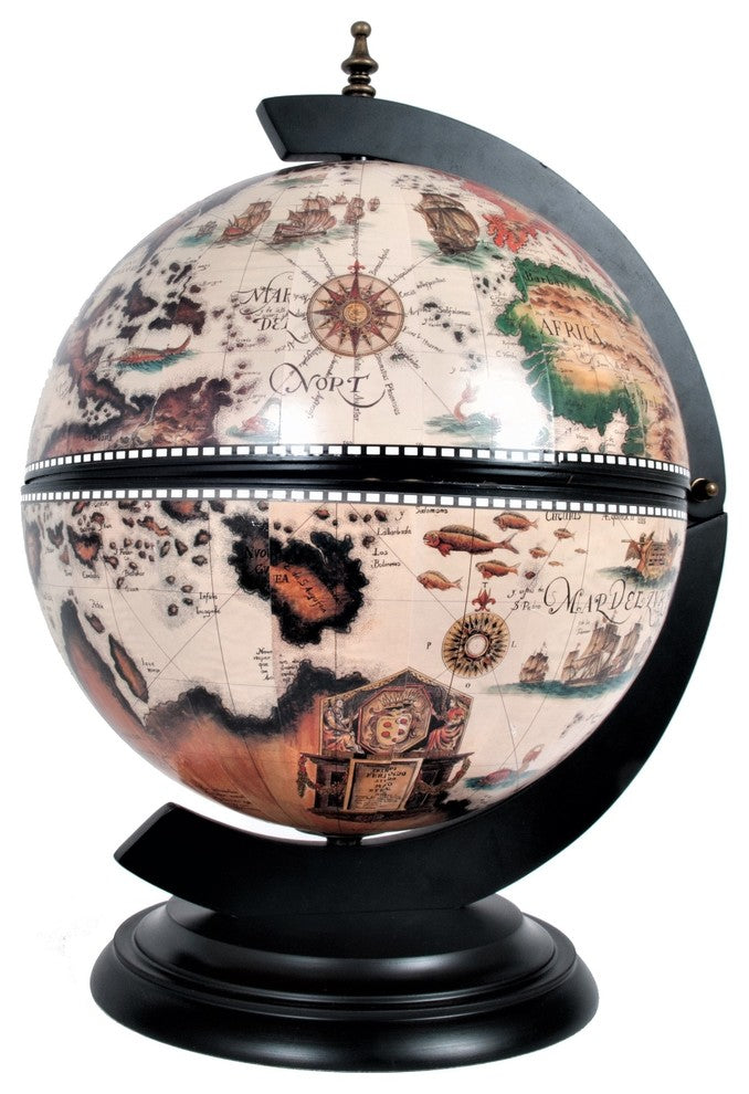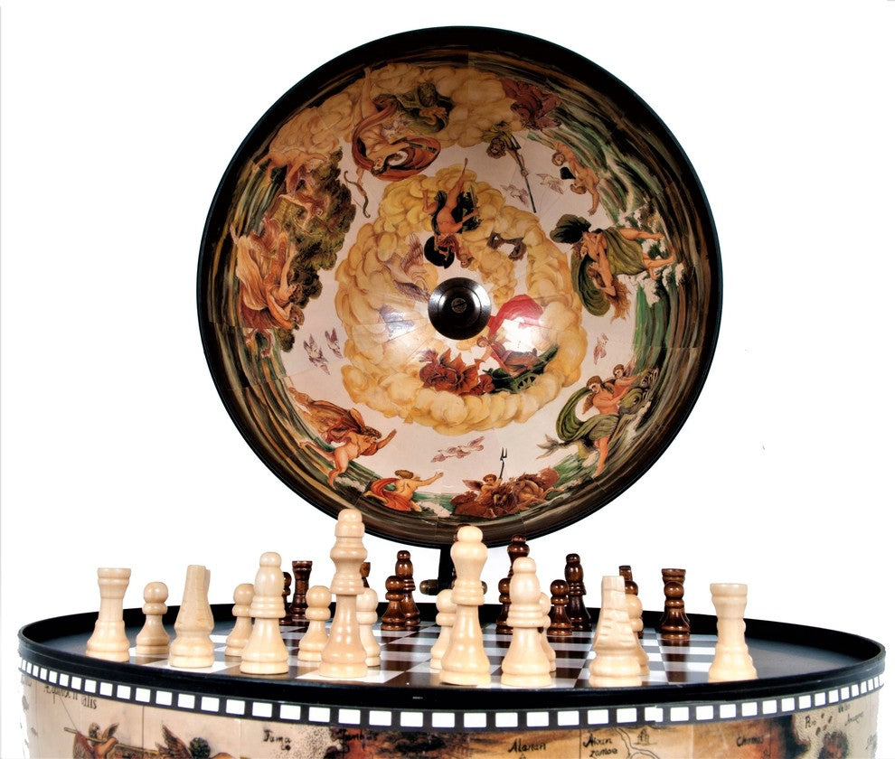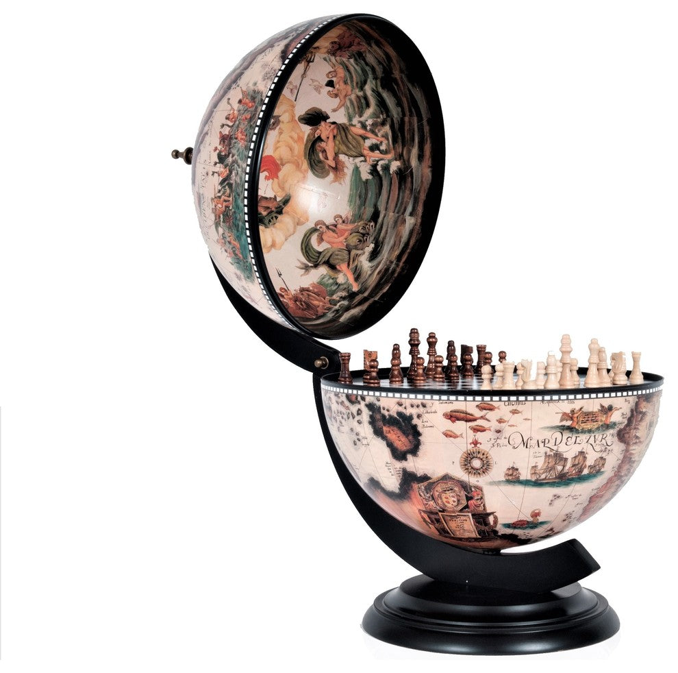This is a unique globe with chess holder. Measured 13 inches in diameter, this globe will make a fine gift or decoration for your home or office! It features a removable chess board, a chess set, and stunning antique replica frescoes on the inner lid of the globe. The outer surface is also imprinted with an antique nautical world map. This globe comes with a dark wood base and requires some light assembly.