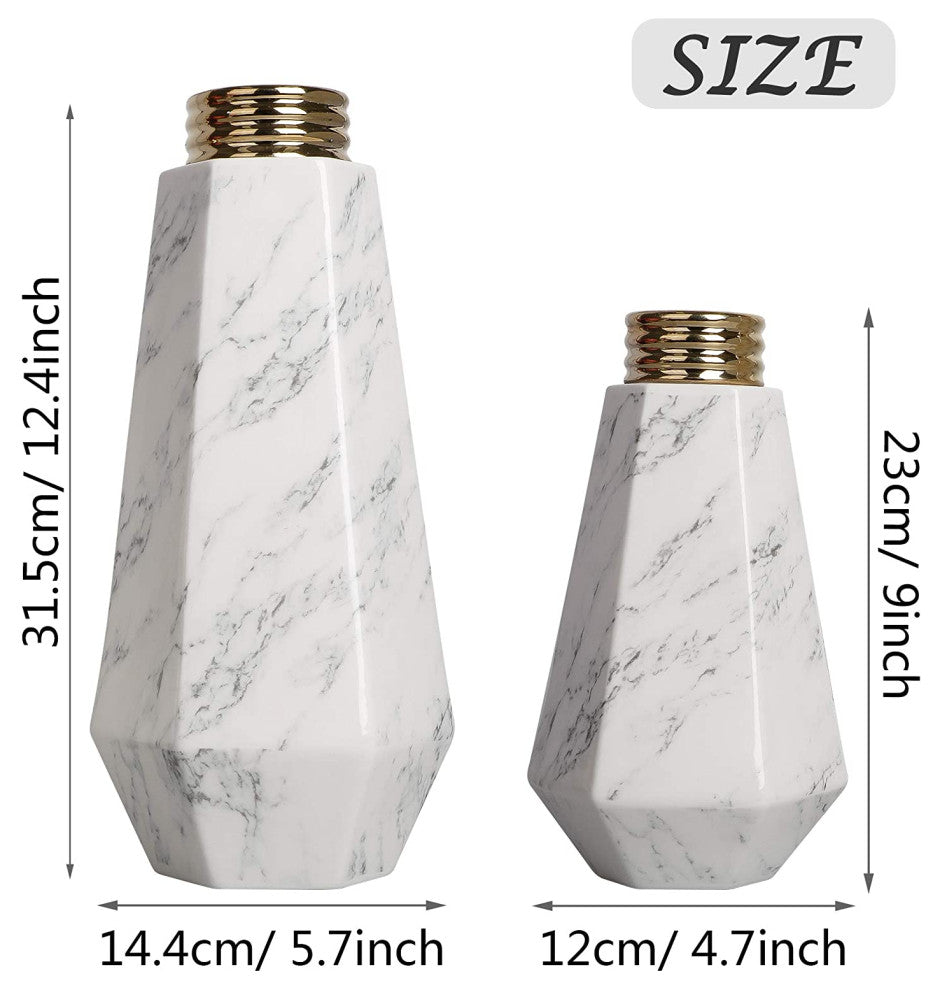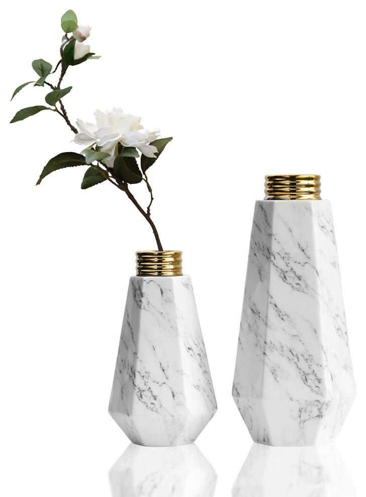 Set of 2 Ceramic Flower Vases with Gold Trim, White and Gold Marble Pattern Geometric Decorative Vases for Centerpieces, Kitchen, Office, Wedding or Living Room. The geometric shape and simple natural marble grain in perfect union, bring out the best in each other, presenting the elegant chic and modern style, brighten up your home with this gorgeous decorative vase.