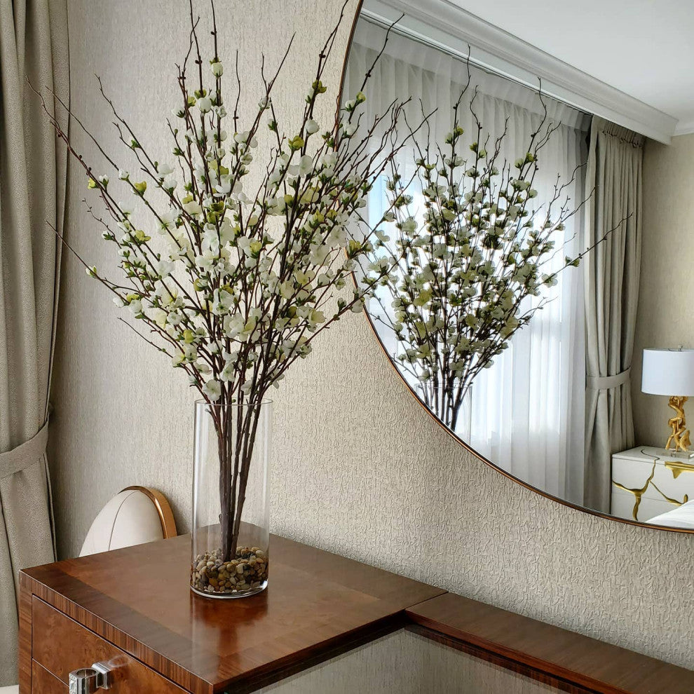 White Spring Blossom Branches Faux Floral Vase, Buds Stones Open Light