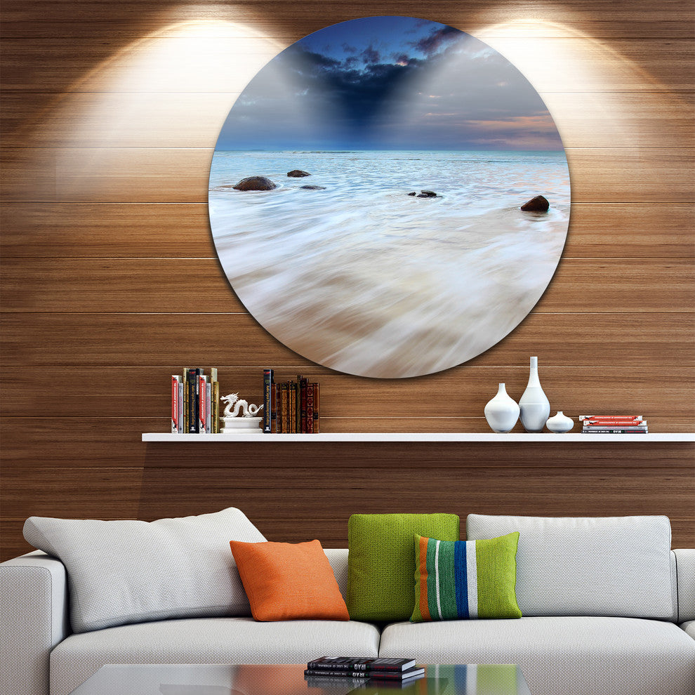 Bring Contemporary Abstraction to your home with this large Circle Metal wall art. This White Waves Over Moeraki Boulders Metal Artwork makes it the focal point of any room or office.