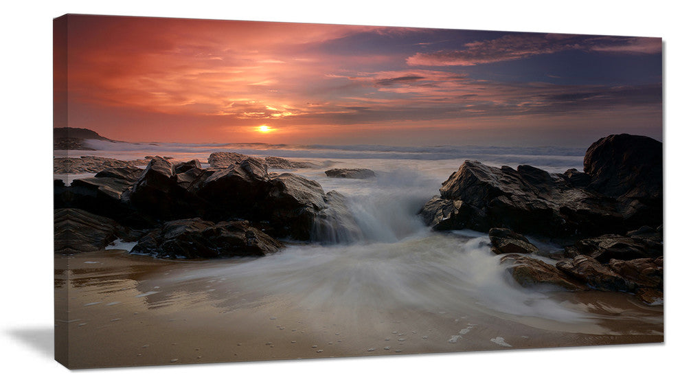 "White Waves Rushing Between Rocks" Contemporary Seascape Art Canvas, 32"x16"