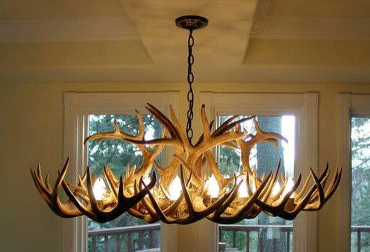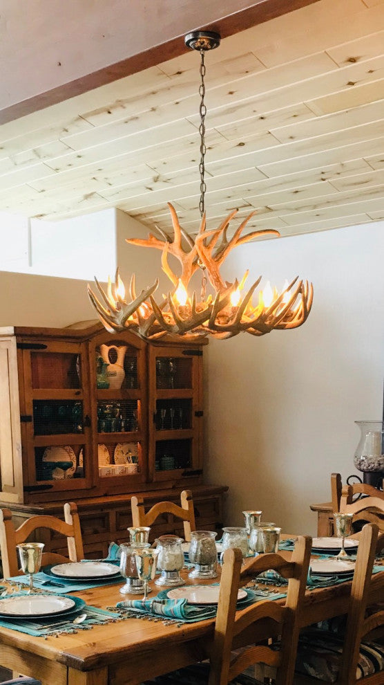 Real Antler Whitetail Oblong Chandelier (38-40"L x 28-29"W x 17"H), 8 Light Sockets, 6 feet of rustic bronze chain.Handmade in North America using top quality naturally shed real antlers. Sockets are made to resemble real antler, each socket rated up to 60 Watts. Comes balanced and ready to hang. Frosted Bent Tip Candelabra Bulbs included. Certified in U.S & Canada (CSA listed to comply with UL 1598)