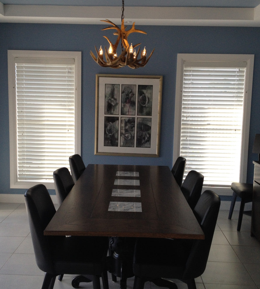 Real Antler Whitetail Single Tier Chandelier (27-29"D x 17"H), 8 Light Sockets, 3 feet of rustic bronze chain. With Parchment Shades.Handmade in North America using top quality naturally shed real antlers. Sockets are made to resemble real antler, each socket rated up to 60 Watts. Comes balanced and ready to hang. Frosted Bent Tip Candelabra Bulbs included. Certified in U.S & Canada (CSA listed to comply with UL 1598)