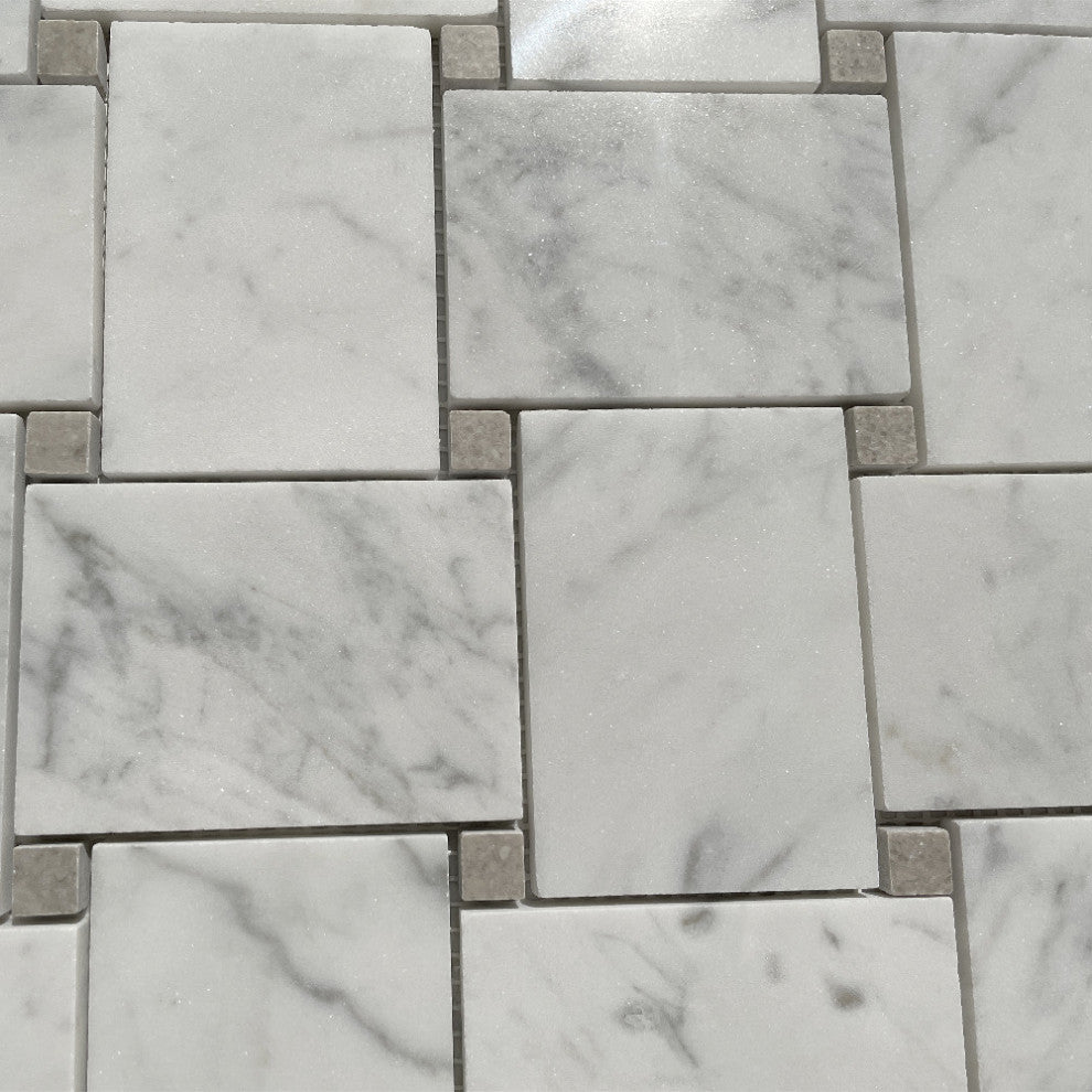 Carrara White Marble 2 1/4x3 1/8" rectangle pieces and Gray 1/2" dots mounted on 11x11" sturdy mesh tile sheet4 rows and 4 columns with 16 stones and 16 dots on each sheet; 5/16" thickness; Polished finishFirst Quality; Natural Beauty; Carefully Selected; Consistent in size and finish; Factory DirectPrice per sheet (0.84 sq.ft.); Large quantities in stockPremium Grade Basketweave White Carrara Marble Mosaic Tile. Italian Bianco Carrera White Venato Carrara Polished Large Basket Weave Mosaic w/ Gray Dots Wall and Floor Tiles are perfect for any residential / commercial projects. The Carrara White Marble 2 1/4 x 3 1/8 inch Basketweave Mosaic Tile with Cinderella Gray Dots can be used for kitchen backsplash, bathroom flooring, shower surround, dining room, entryway, corridor, kitchen backsplash, spa, etc. Our timeless Glossy White Carrera Marble Large Basketweave Mosaic Tile with a large selection of coordinating products is available and includes hexagon, herringbone, brick mosaics, 12x12, 18x18, 24x24, subway tile, moldings, borders, and more.Number of Pieces Included: 1Sq. ft. in 1 Quantity: 0.84Mesh Backing