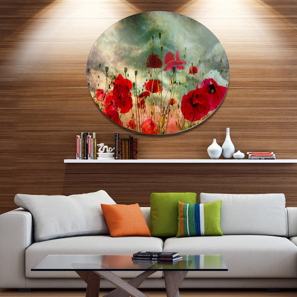Bring Contemporary Abstraction to your home with this large Circle Metal wall art. This Wild Red Poppy Flowers in Sky Metal Artwork makes it the focal point of any room or office.