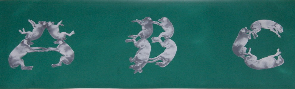 "A,B,C...Z" by William Wegman, 1993 Unsigned Serigraph. Paper size is 13 x 360 inches, with an image size of 13 x 360 inches. The Serigraph is from an edition size of 1500 and is not framed. The condition was rated A: Mint. Additional details: Hand printed silk-screen on custom colored wallpaper grounds. Numbered edtion of 1500 in each of 5 colors. The photograph only shows letters "A" through "C", but the print extends to the letter "Z". UNSIGNED.
