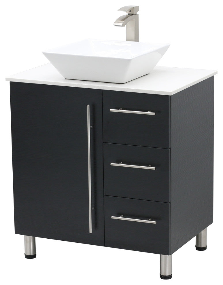 Vanity cabinet:•  Brand: WindBay •  Cabinet width : 29"•  Cabinet depth: 20"•  Cabinet height without countertop: 31-3/4"•  Heavy duty soft-closing drawer gliders. •  Durable finish and easy to maintain.•  Upgraded brackets. Construction hurricane grade brackets.•  Heavy Duty hydraulic soft-closing hinges.•  Cabinet fully assembled. Customer must install the legs and handles.•  Completely finished panels, including edges.•  Stainless steel adjustable legs.White stone countertop:The countertop is made from white stone. Polished in a high durable stain and scratch resistant finish. One faucet hole and one drain hole are prefabricated. •  Width: 30" •  Depth: 20-1/2" •  Faucet hole: 1-3/8"(35mm) diameter •  Drain hole: 1-3/4"(45mm) diameterWhite ceramic vessel sink: •  Width: 16" •  Depth: 16" •  Height: 5"Includes: Sink, countertop, vanity cabinet, handles, and legs. The faucet and drain are not included.Attention:Due to screen differences, the actual color may vary slightly from what appears on your monitor or phone. Contact us for a color sample if you need help selecting a finish.