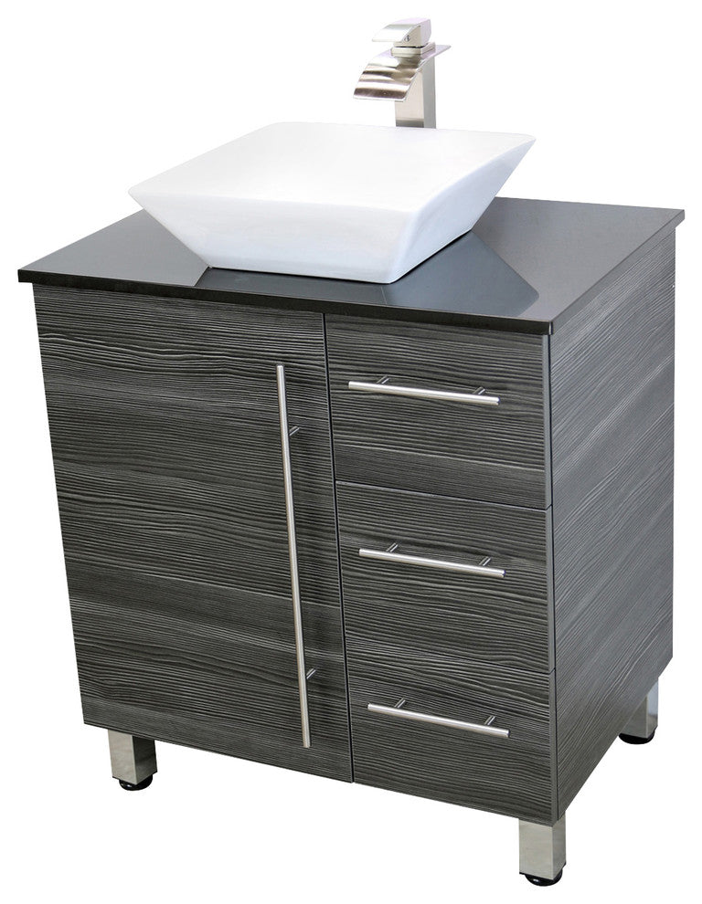 Vanity cabinet:•  Brand: WindBay •  Cabinet width : 29"•  Cabinet depth: 20"•  Cabinet height without countertop: 31-3/4"•  Heavy duty soft-closing drawer gliders. •  Durable finish and easy to maintain.•  Upgraded brackets. Construction hurricane grade brackets.•  Heavy Duty hydraulic soft-closing hinges.•  Cabinet fully assembled. Customer must install the legs and handles.•  Completely finished panels, including edges.•  Stainless steel adjustable legs.Black stone countertop: The countertop is made from black stone. Polished in a high durable stain and scratch resistant finish. One faucet hole and one drain hole are prefabricated. •  Width: 30"•  Depth: 20-1/2"•  Faucet hole: 1-3/8"(35mm) diameter•  Drain hole: 1-3/4"(45mm) diameterWhite ceramic vessel sink: •  Width: 16" •  Depth: 16" •  Height: 5"Includes: Sink, countertop, vanity cabinet, handles, and legs. The faucet and drain are not included.Attention:Due to screen differences, the actual color may vary slightly from what appears on your monitor or phone. Contact us for a color sample if you need help selecting a finish.